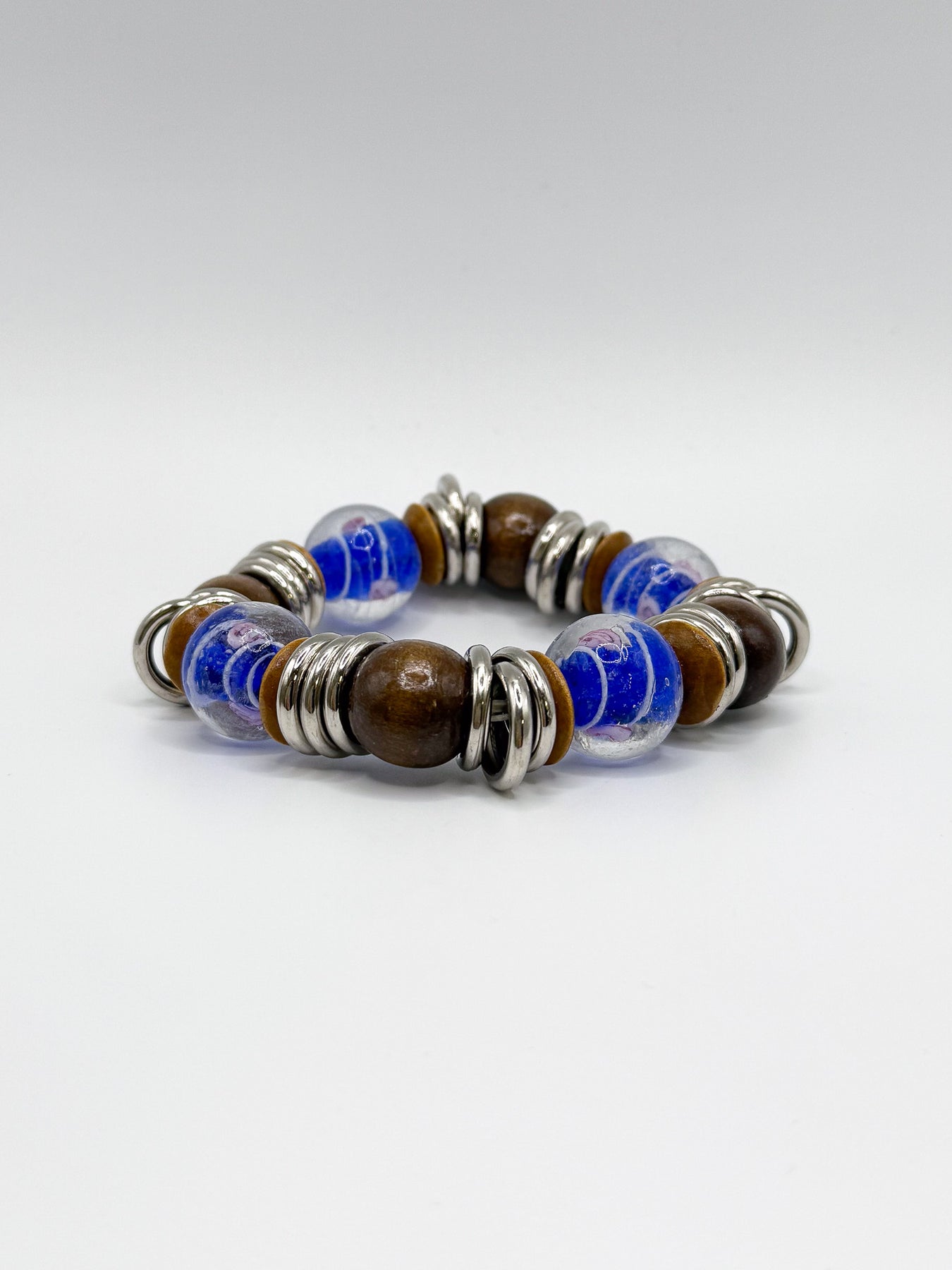 Die Kombination aus strukturierten Perlen und metallischen Elementen verleiht dem Armband eine markante, zugleich ausgewogene Wirkung. Unterschiedliche Oberflächen und Farbtöne greifen harmonisch ineinander und machen es zu einem ausdrucksstarken Begleiter – solo getragen oder im Zusammenspiel mit weiterem Schmuck.