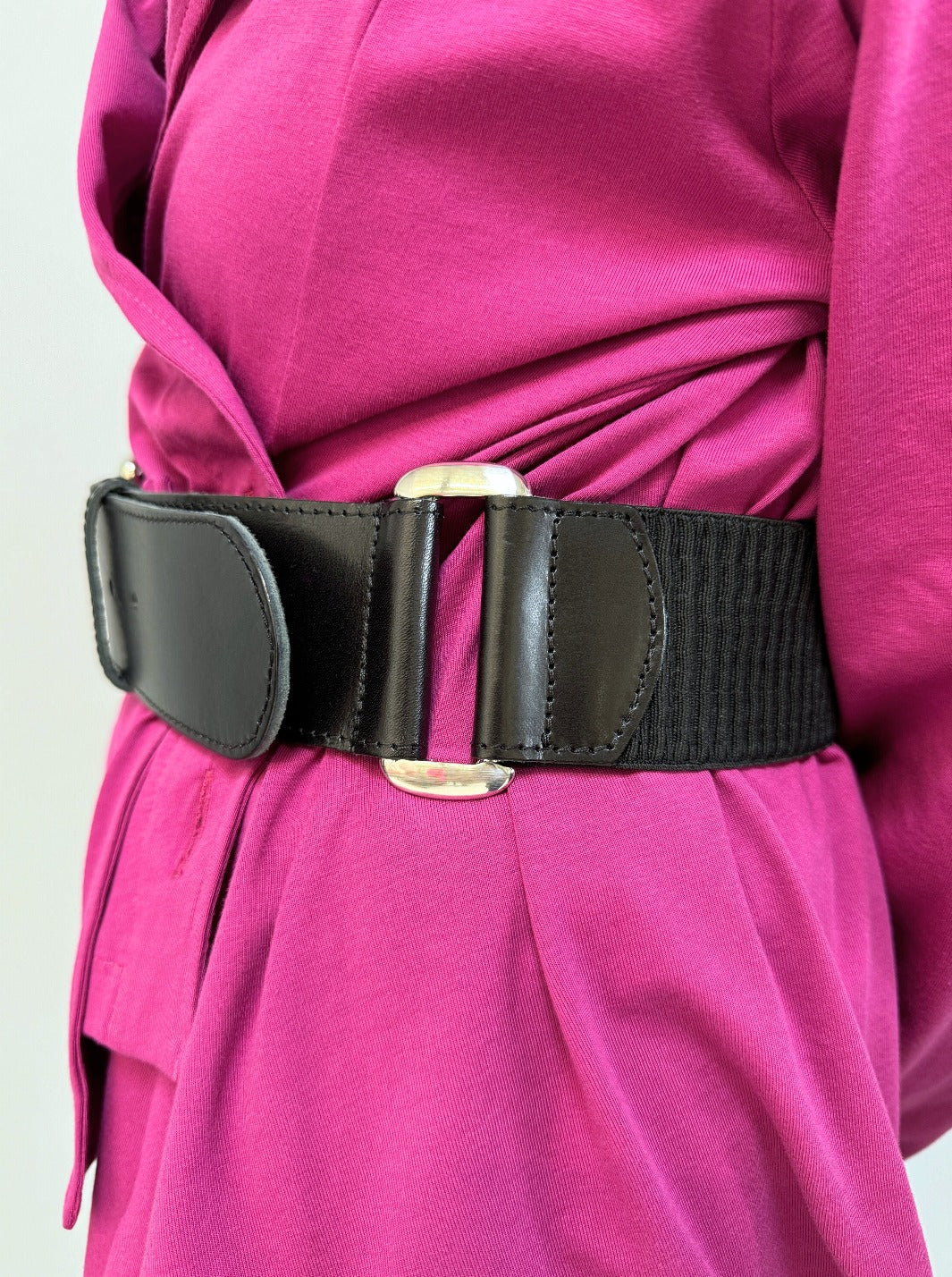 Die große Silberschnalle ist ein markantes Merkmal dieses Gürtels und verleiht ihm einen modernen und edlen Touch. Sie dient nicht nur als praktischer Verschluss, sondern auch als stilvolles Statement. Die Silberringe an beiden Seiten, wo das Leder und der Gummibund zusammenkommen, sind raffinierte Details, die den Gürtel zusätzlich aufwerten. Sie verleihen ihm eine subtile Eleganz und fügen einen Hauch von Raffinesse hinzu.