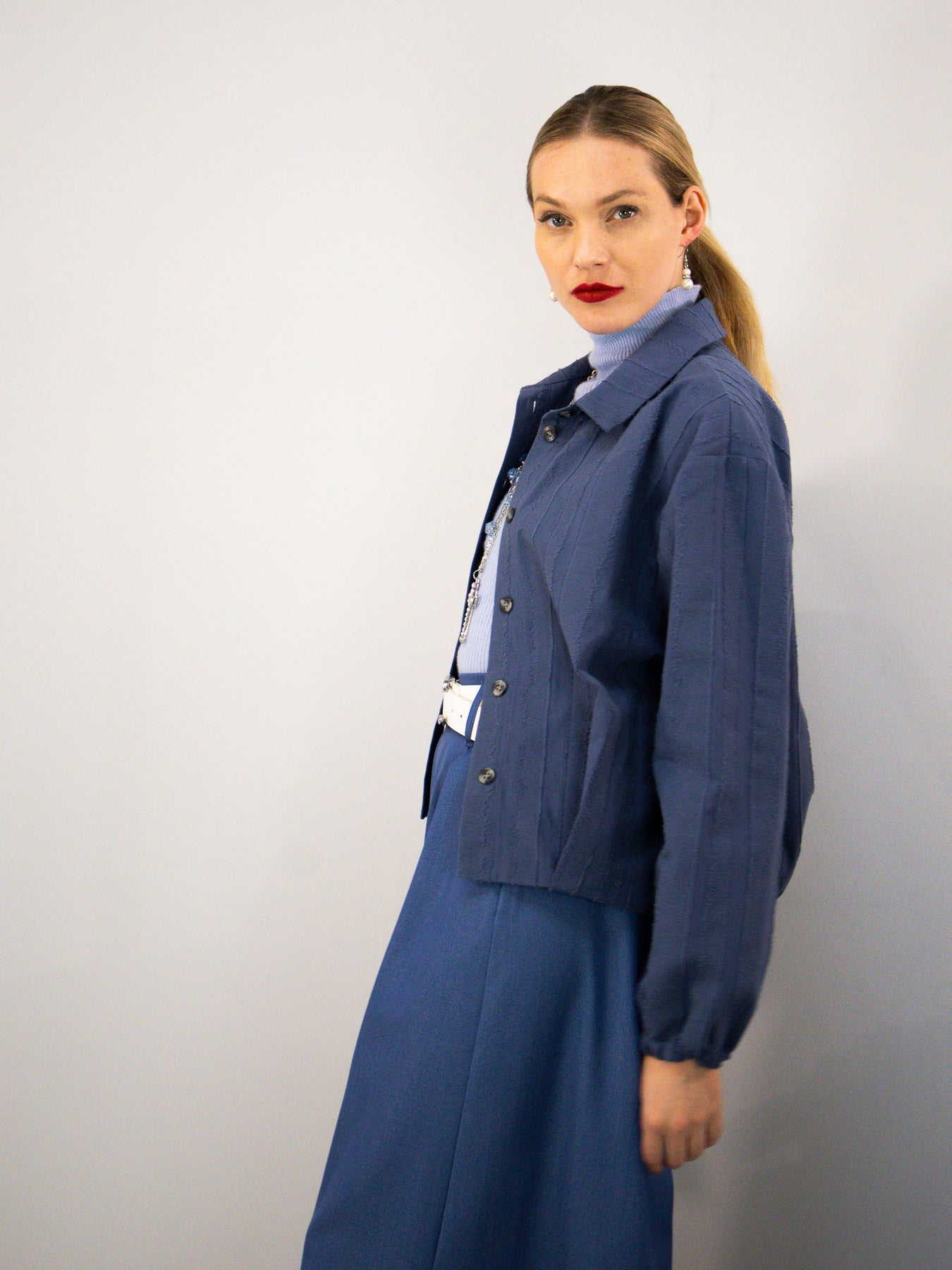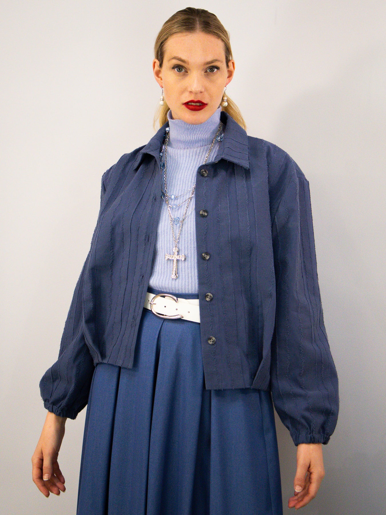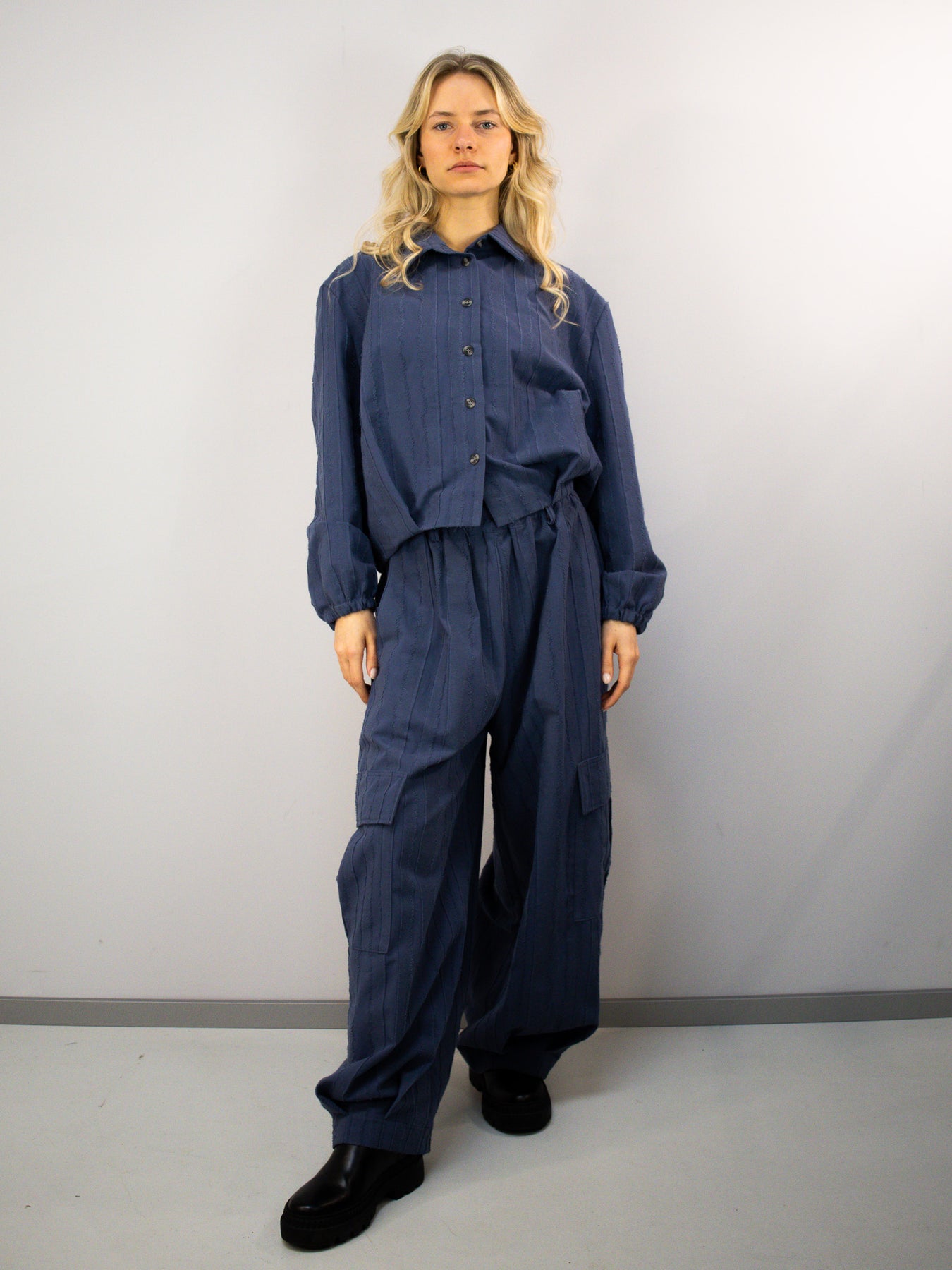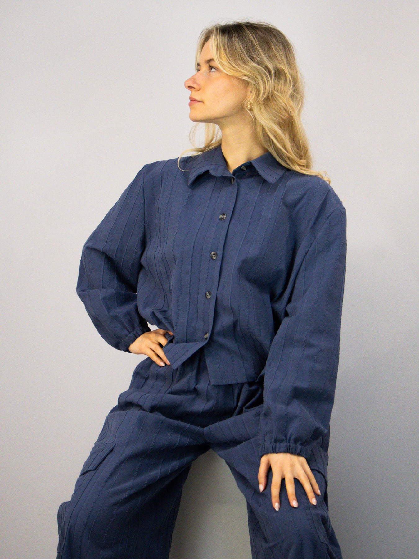 Diese blaue Bluse aus 100 % Baumwolle überzeugt durch ihre besondere Stoffstruktur und eine klare, moderne Silhouette. Der leicht verkürzte Schnitt verleiht dem Design eine zeitgemäße Leichtigkeit, während die feinen vertikalen Strukturen dem Material Tiefe und Charakter geben.