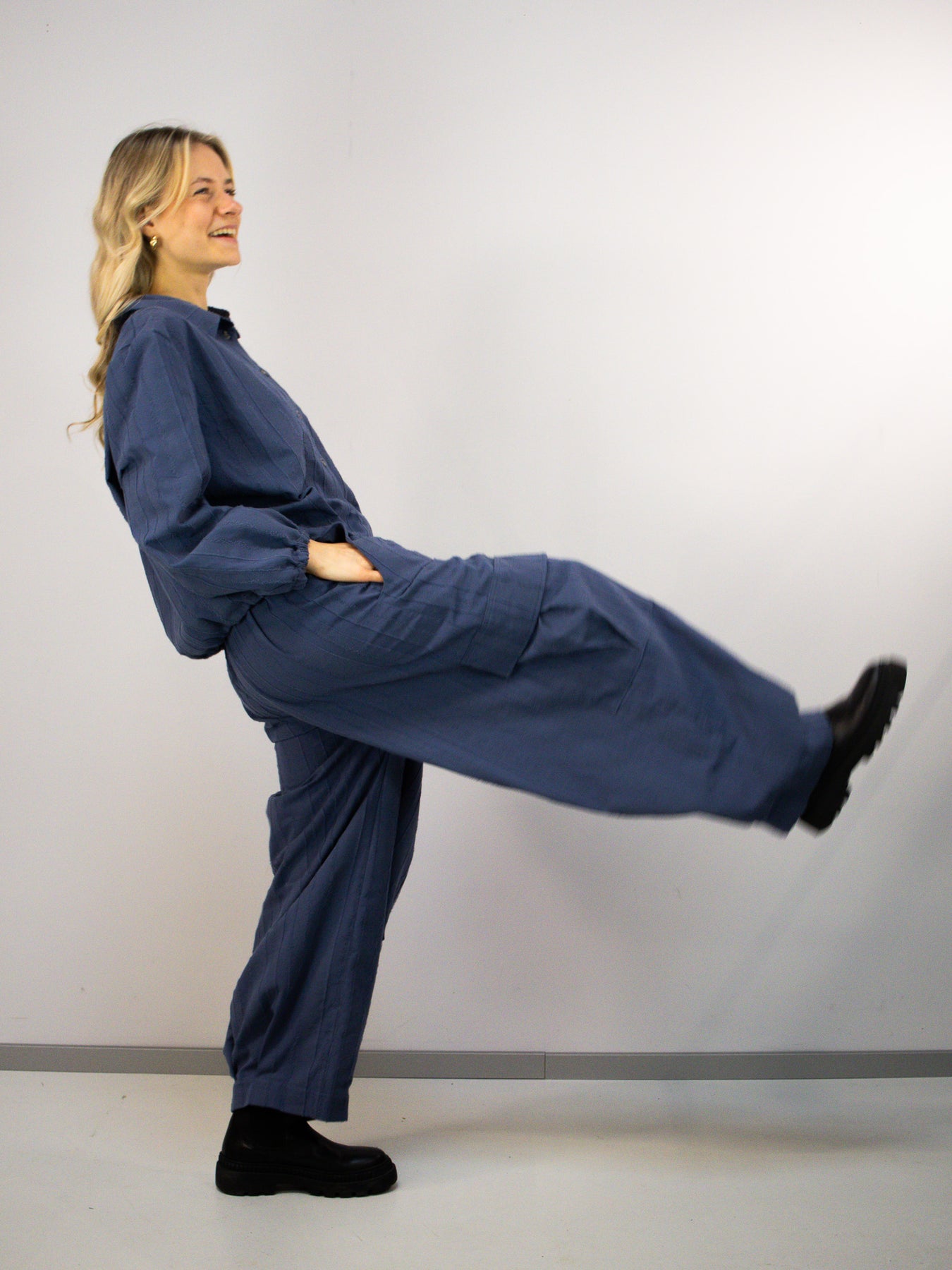 Die Bluse ist im Set mit der passenden Hose erhältlich und ergibt zusammen einen harmonischen, modernen Gesamtlook.