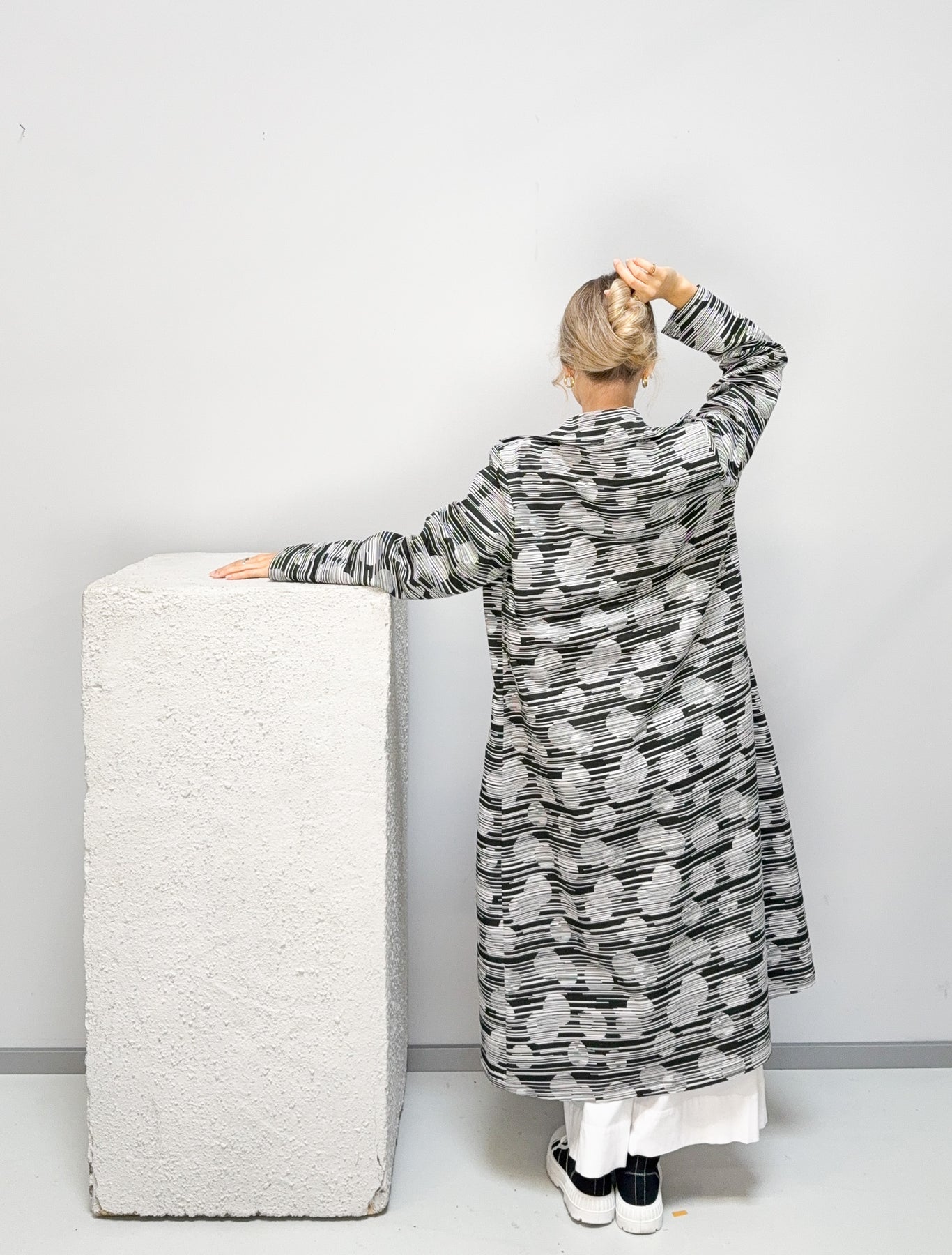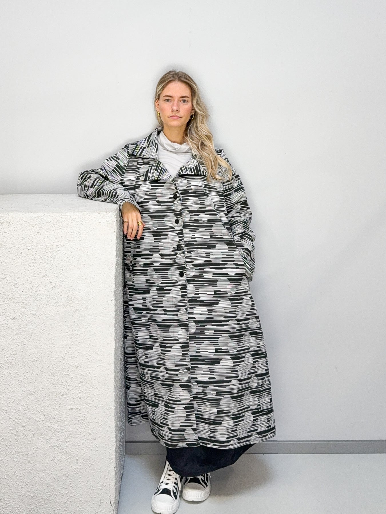 Exklusiver Mantel mit markantem Schwarz-Weiß-Muster, gefertigt in Deutschland aus 95 % Baumwolle und 5 % Elastan. Die Einheitsgröße sorgt für eine bequeme Passform, während seitliche Eingriffstaschen praktischen Komfort bieten. Ein einzigartiges Statement-Piece für stilbewusste Auftritte.