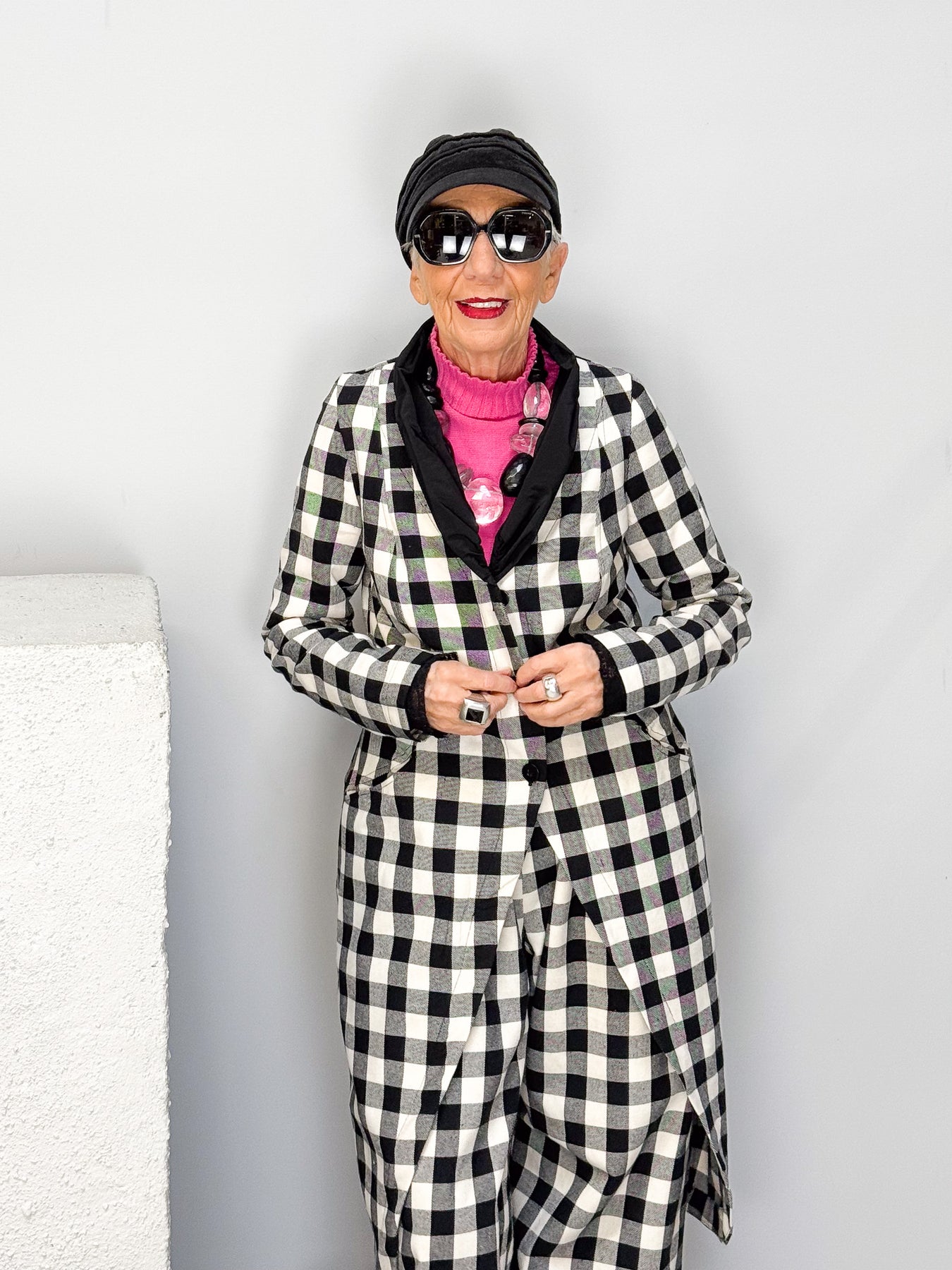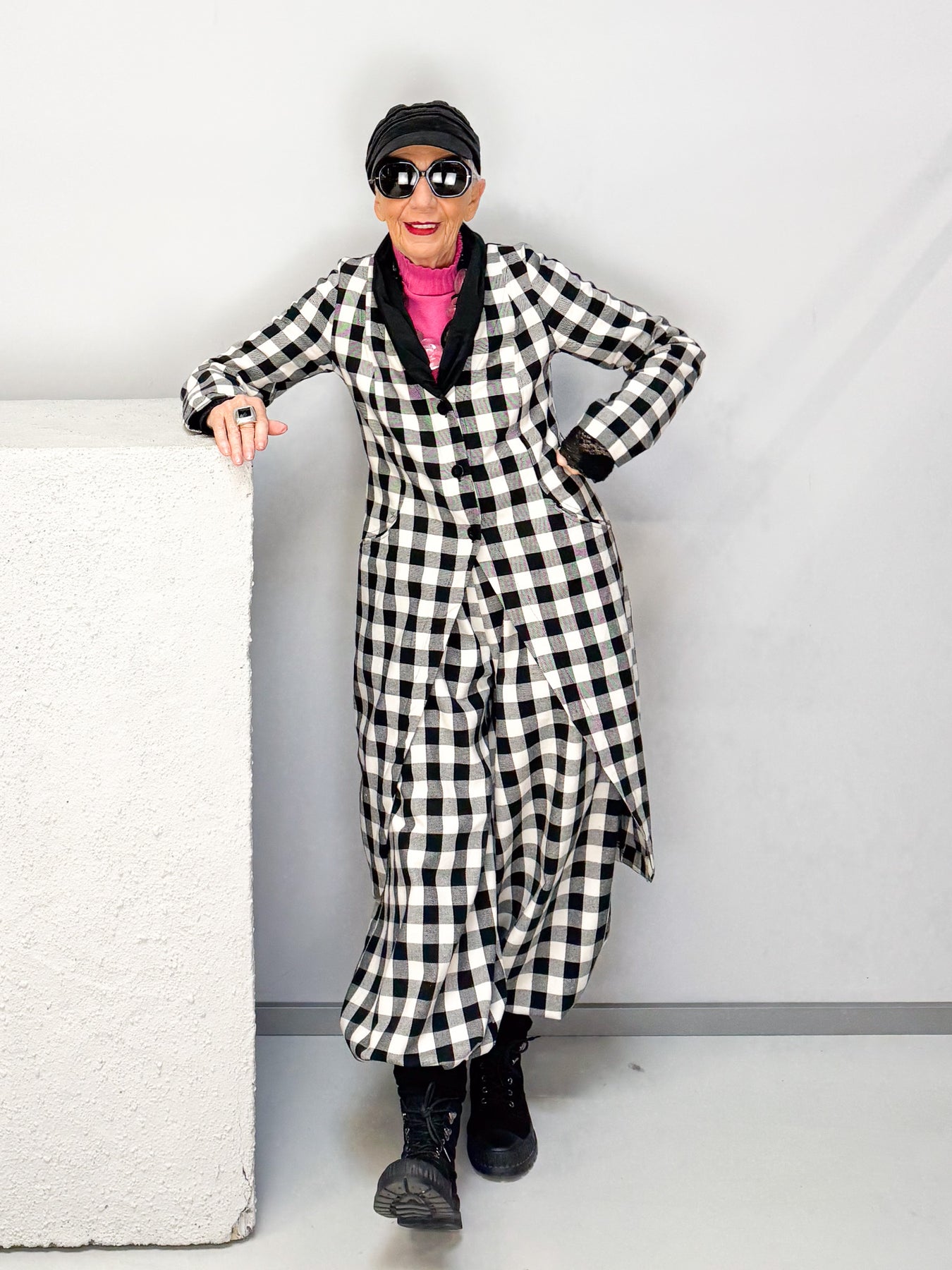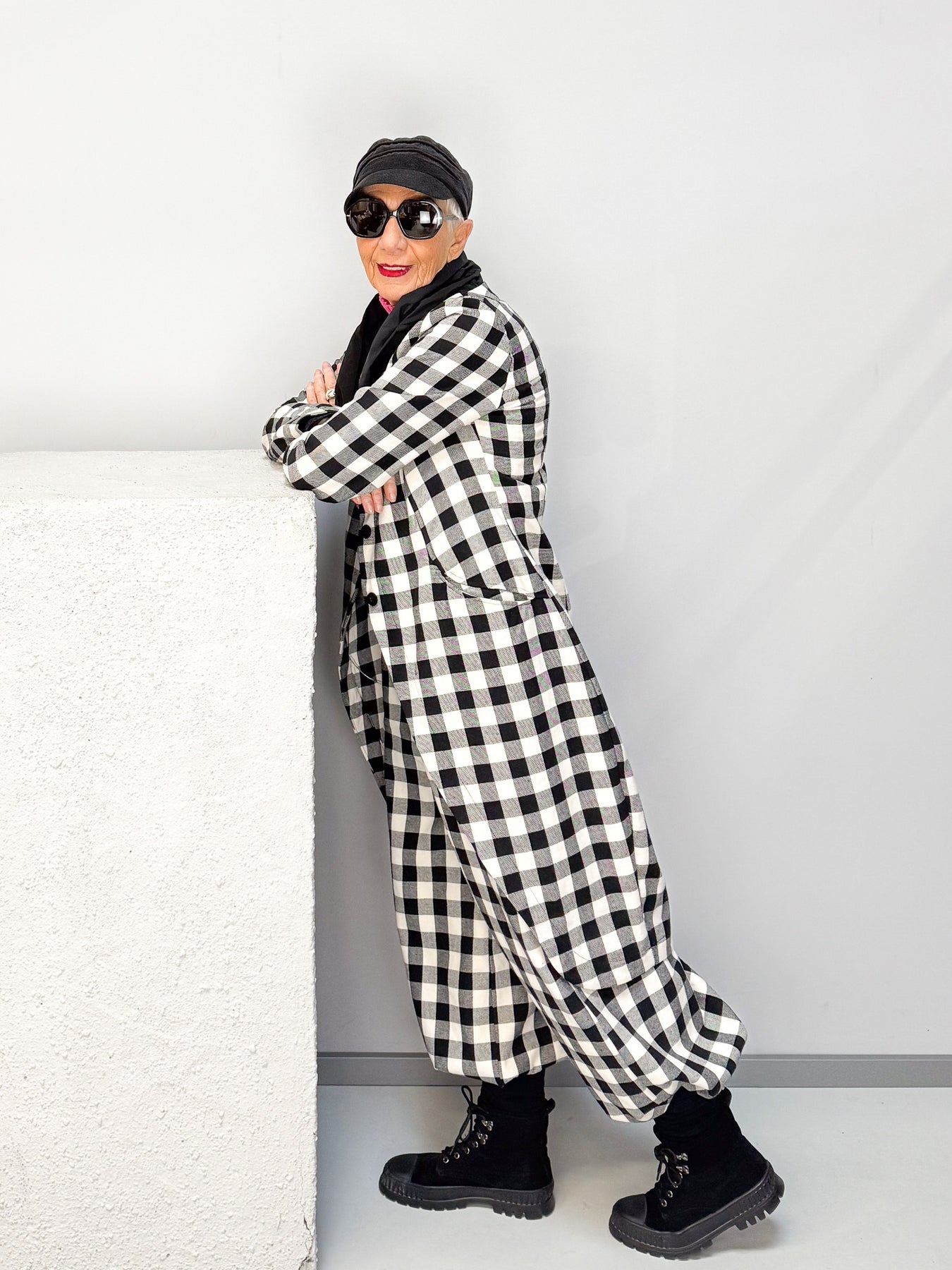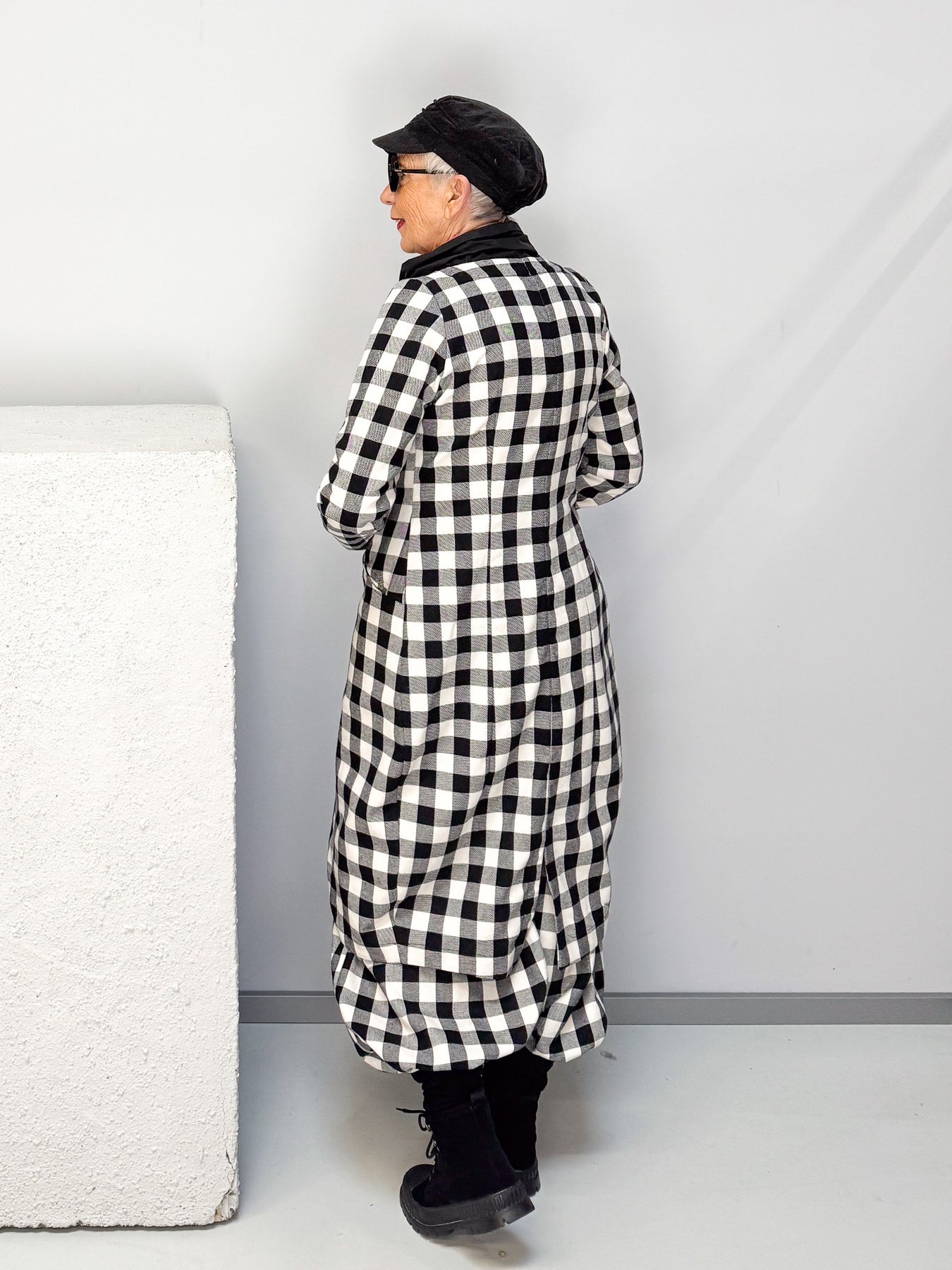 Ein echter Statement-Look: Der Frackmantel im auffälligen Schwarz-Weiß-Karo ist ein modisches Highlight mit Charakter. Sein figurumspielender Schnitt mit elegant abgerundetem Saum und kontrastierendem Revers macht ihn zu einem besonderen Begleiter – ob lässig im Alltag oder stilvoll zu besonderen Anlässen. Der weiche Baumwollanteil sorgt für hohen Tragekomfort, während die markante Optik jedem Outfit das gewisse Etwas verleiht.