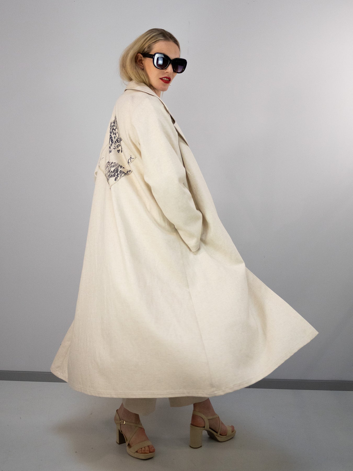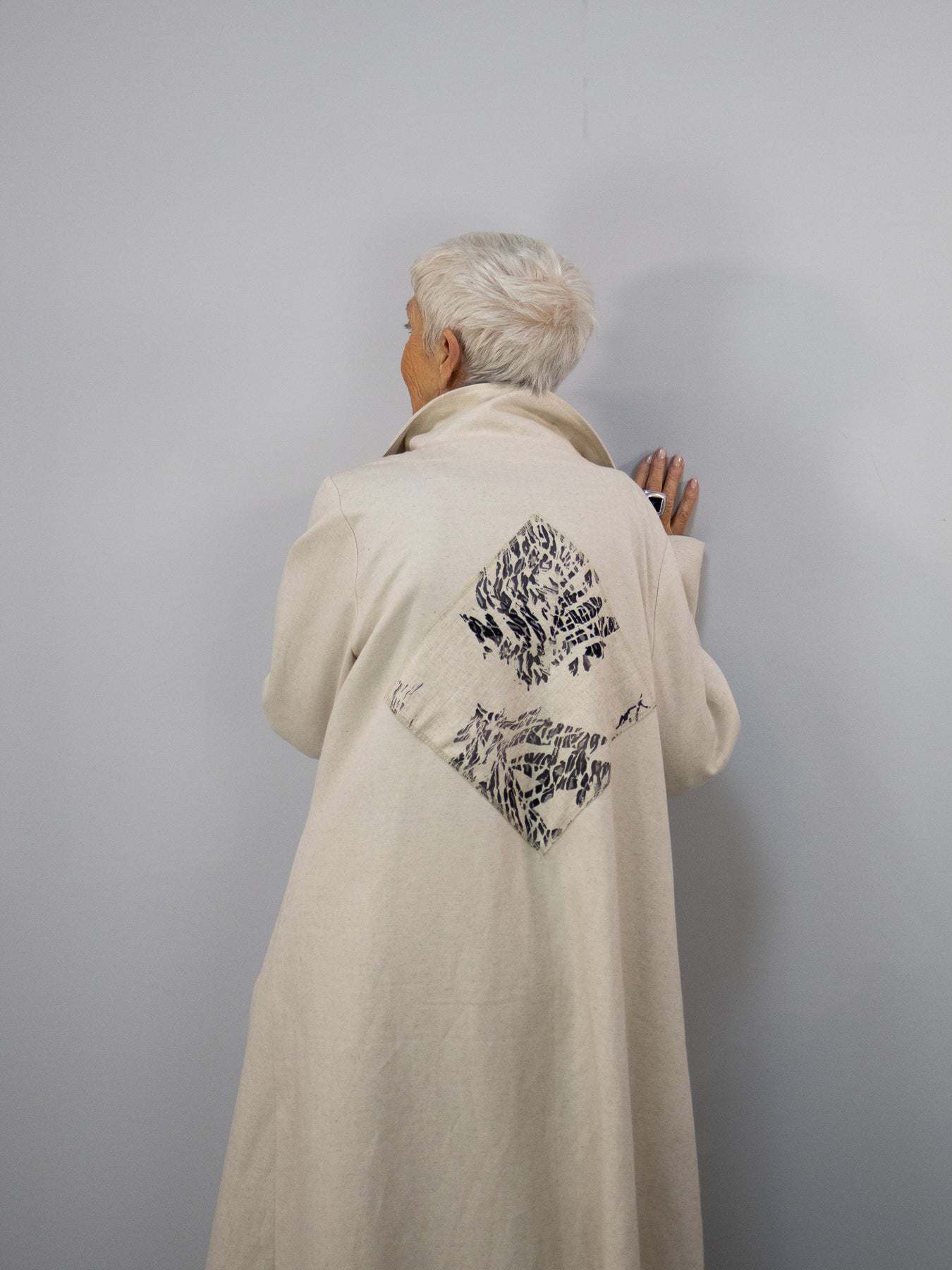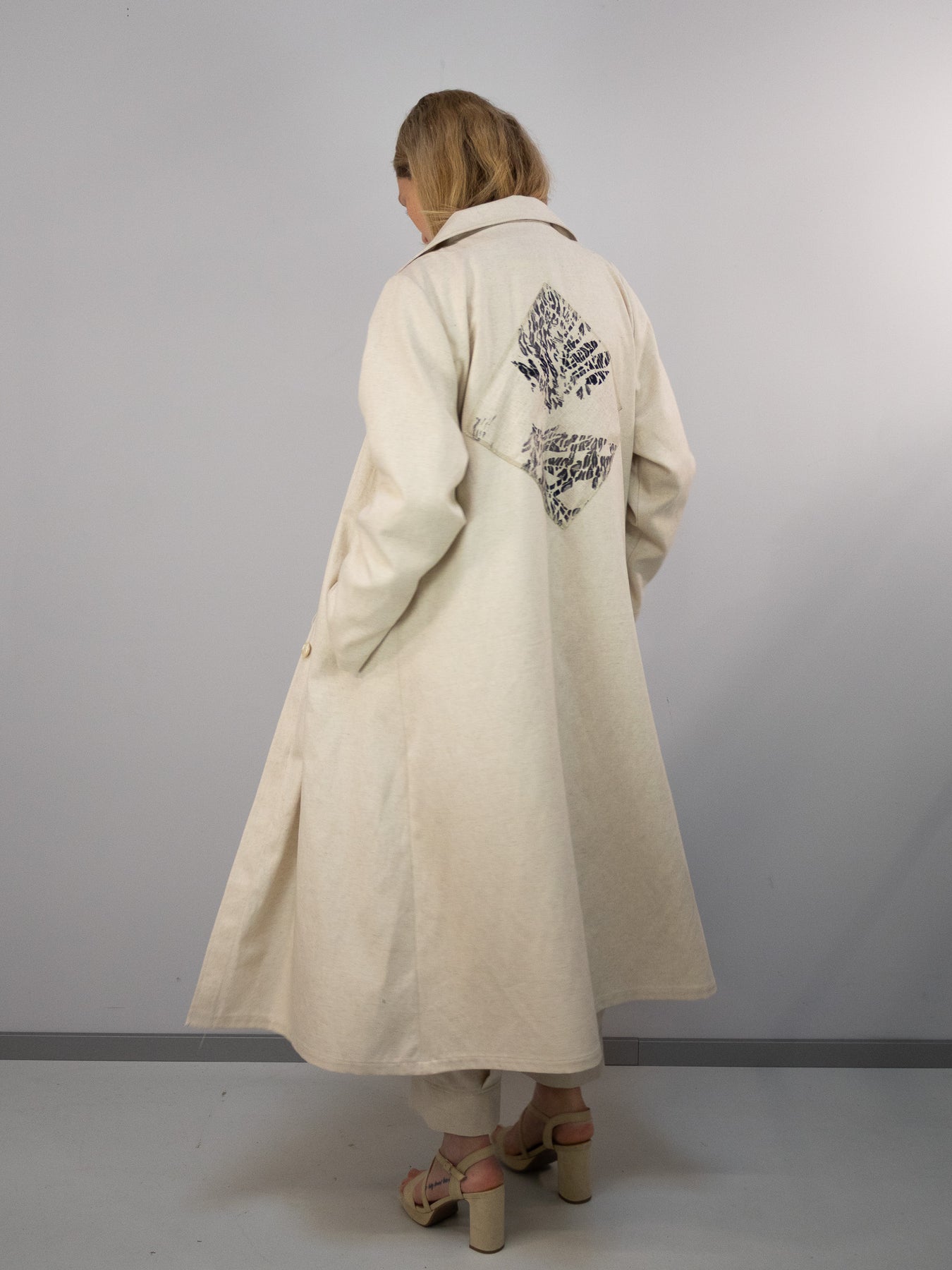 Von vorne wirkt der Mantel bewusst reduziert und klar – auf der Rückseite entfaltet er seine ganze Ausdruckskraft. Genau dieses Spiel zwischen Zurückhaltung und Detail macht ihn zu einem besonderen Statement-Piece.
