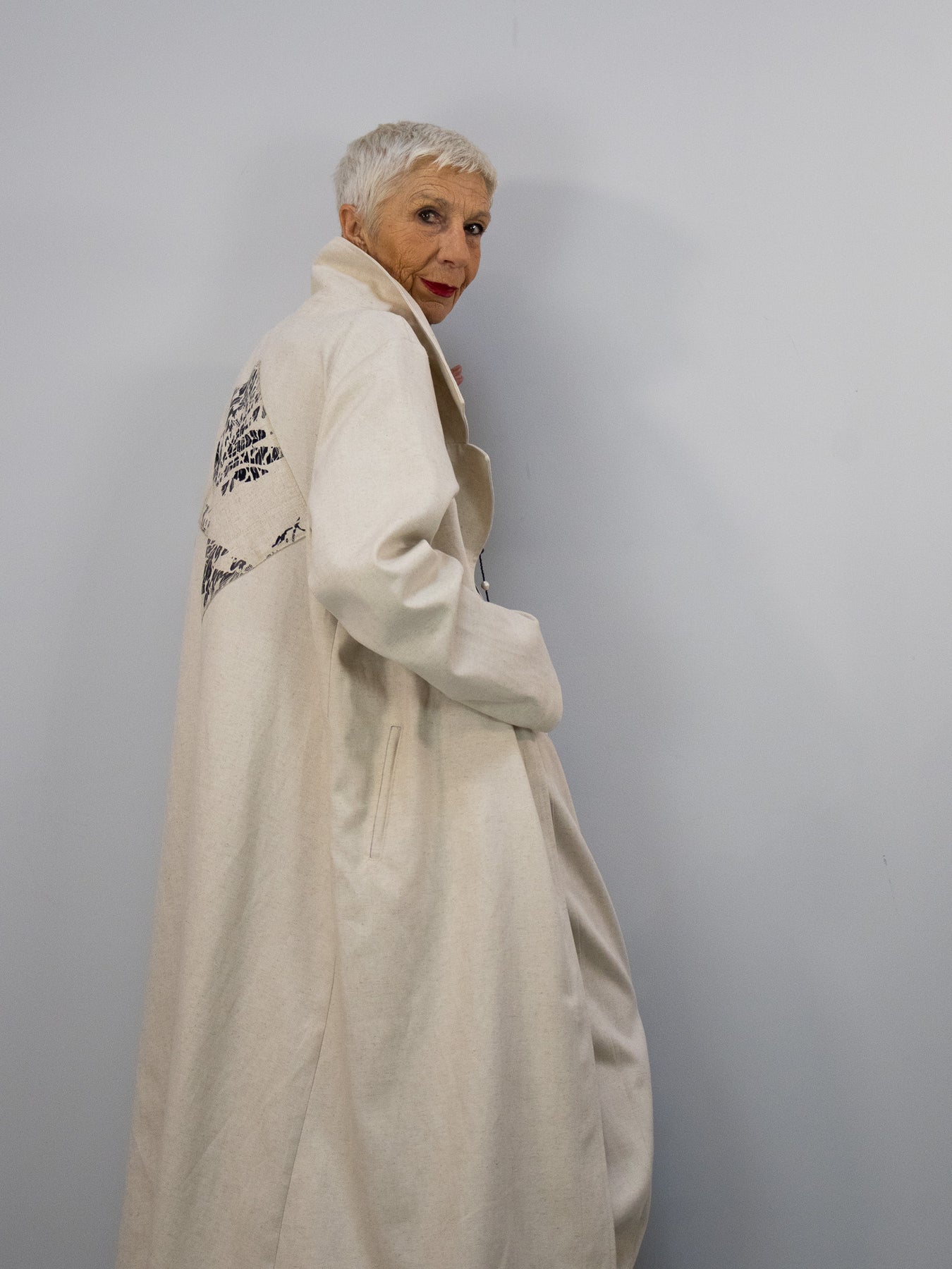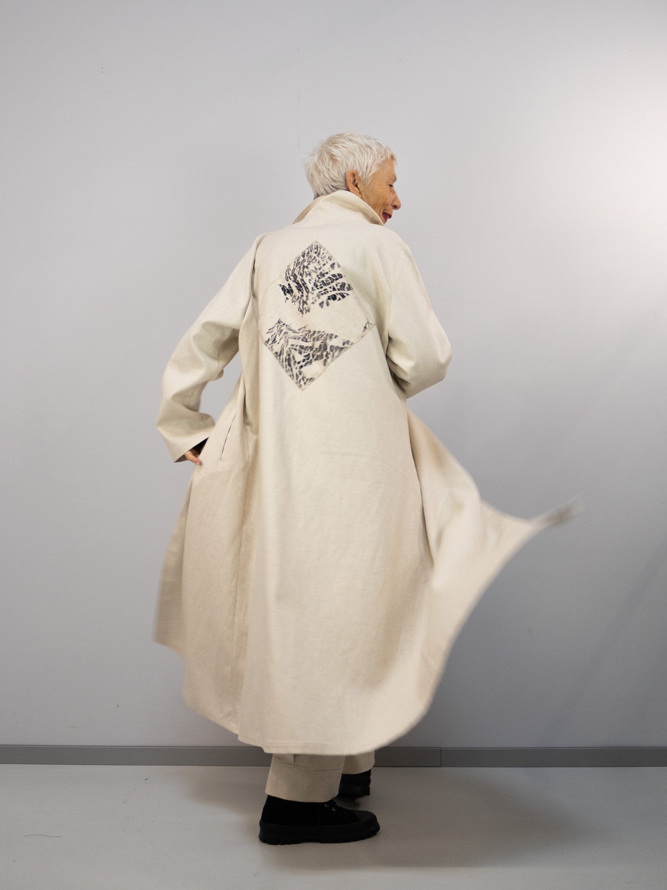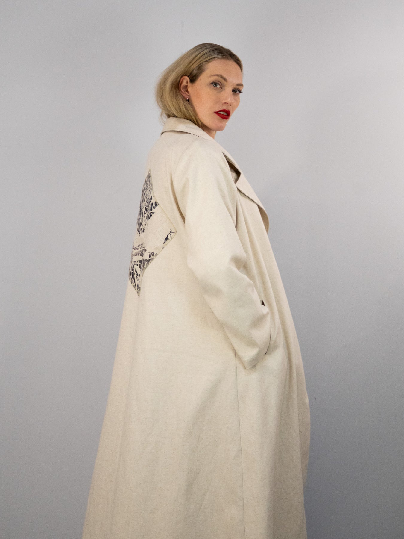 Von vorne wirkt der Mantel bewusst reduziert und klar – auf der Rückseite entfaltet er seine ganze Ausdruckskraft. Genau dieses Spiel zwischen Zurückhaltung und Detail macht ihn zu einem besonderen Statement-Piece.