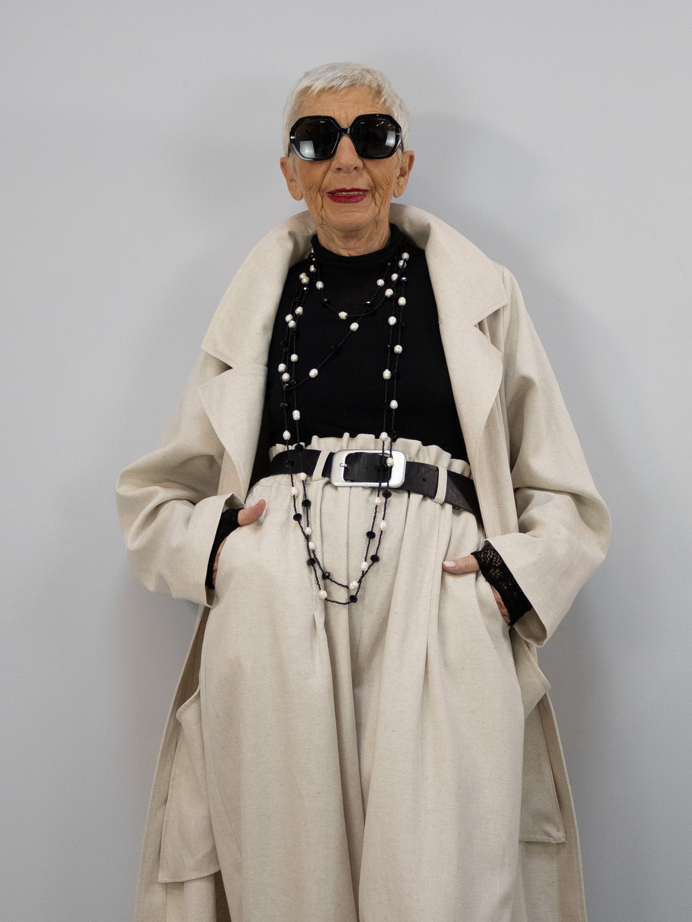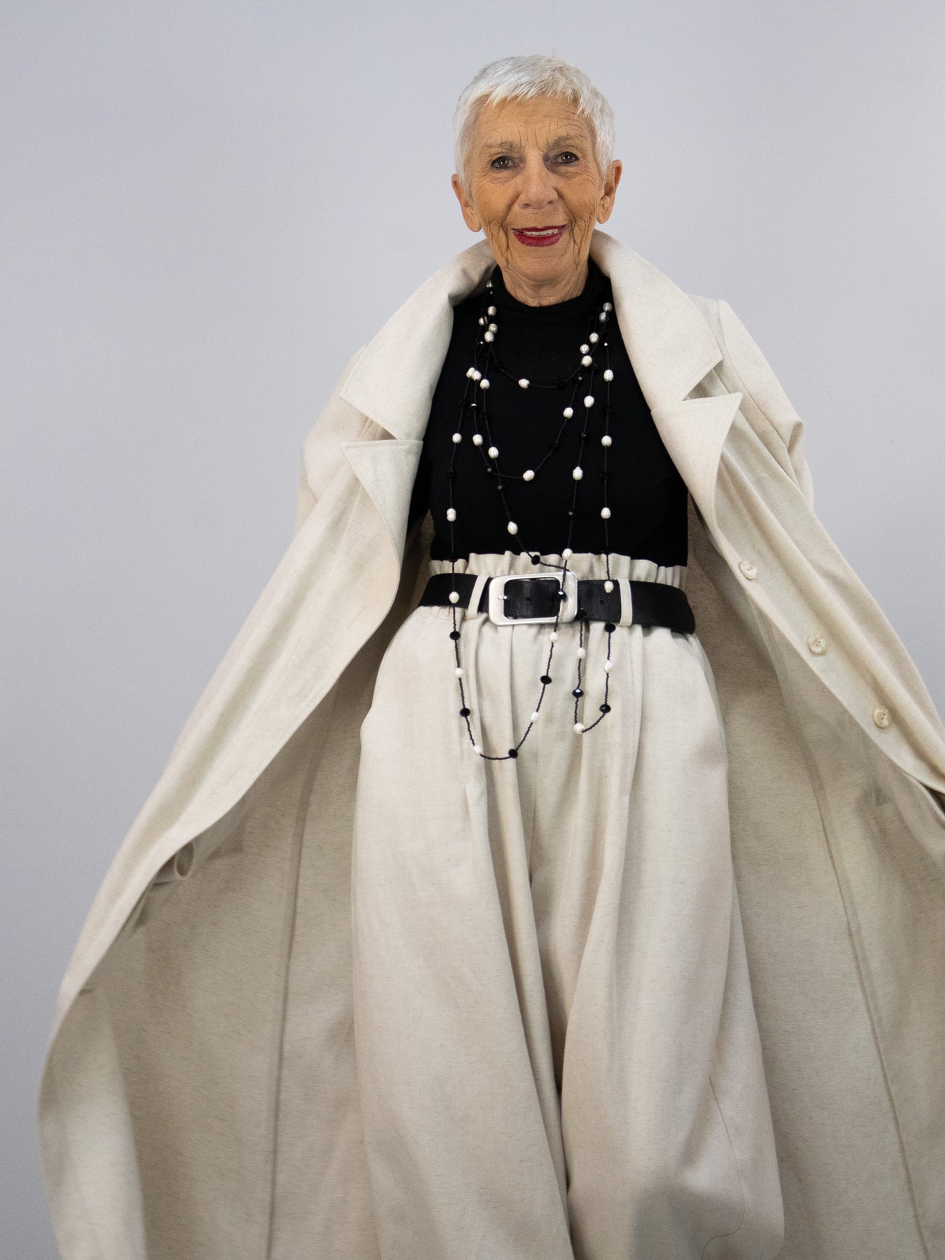 Besonders harmonisch wirkt der Mantel in Kombination mit der passenden beigen Hose für einen ruhigen, eleganten Gesamtlook. Für einen ausdrucksstärkeren Auftritt kann er zudem mit dem Rock im gleichen Muster kombiniert werden – so entsteht ein spannendes Zusammenspiel aus Fläche und Detail.