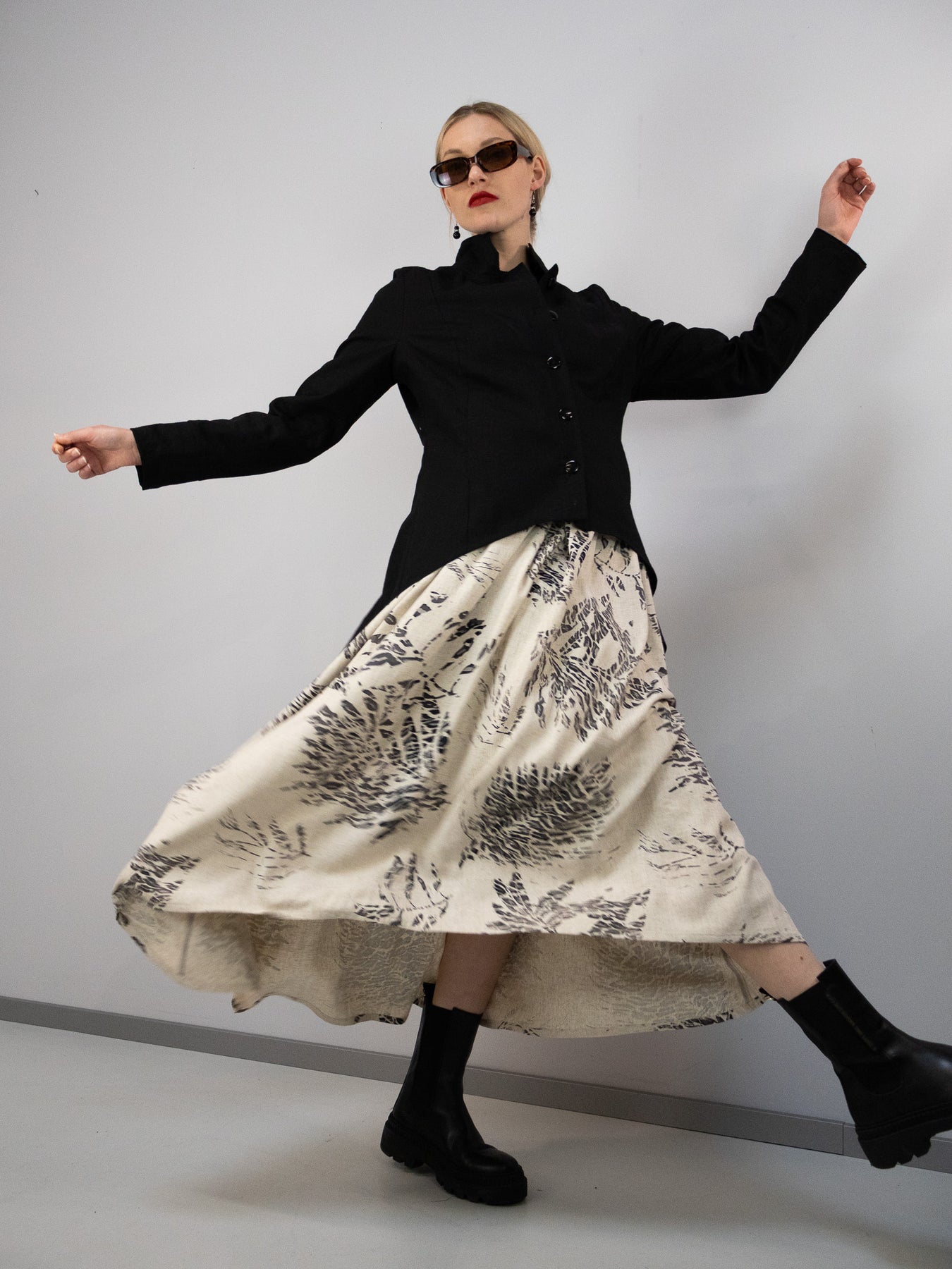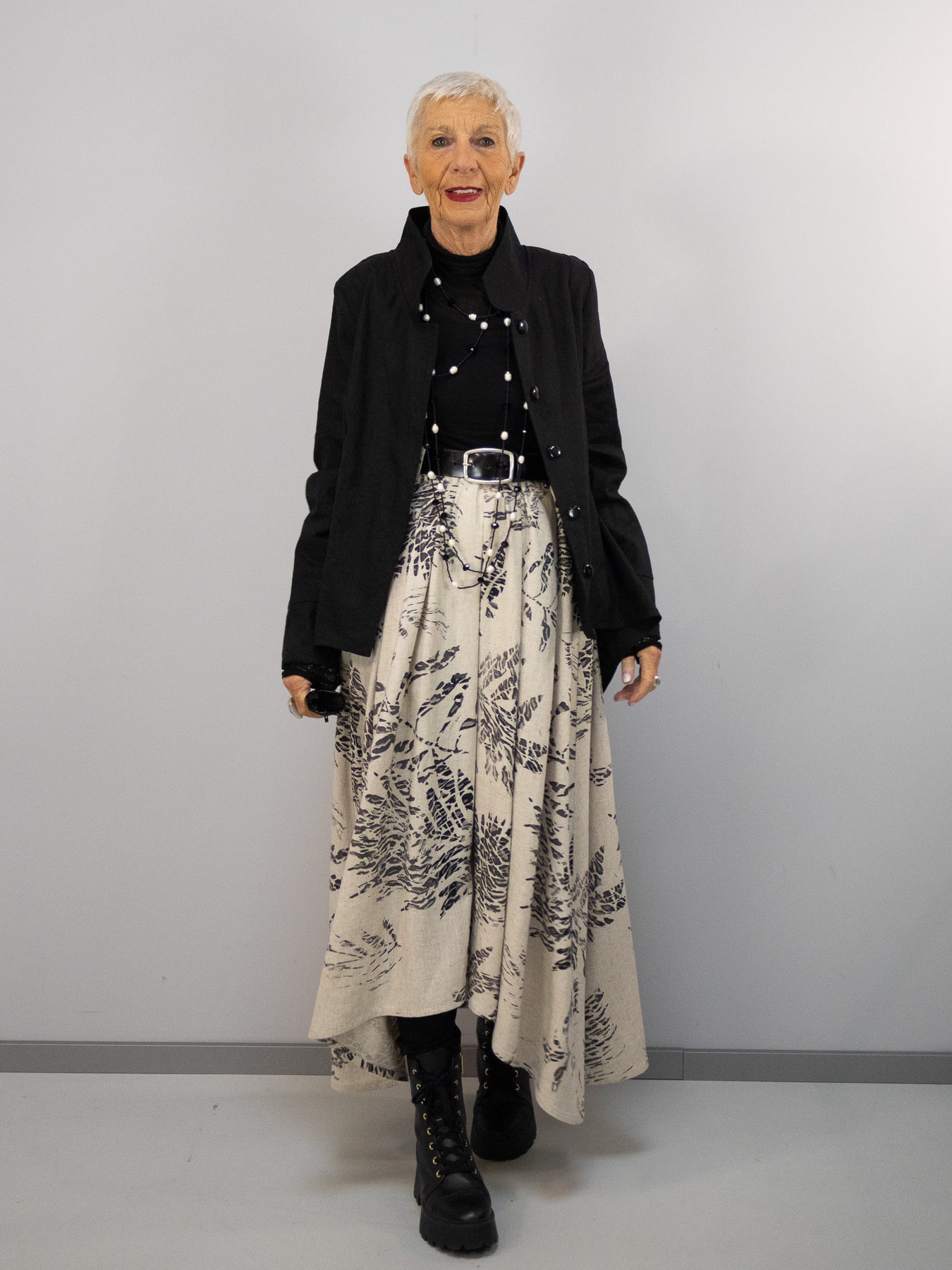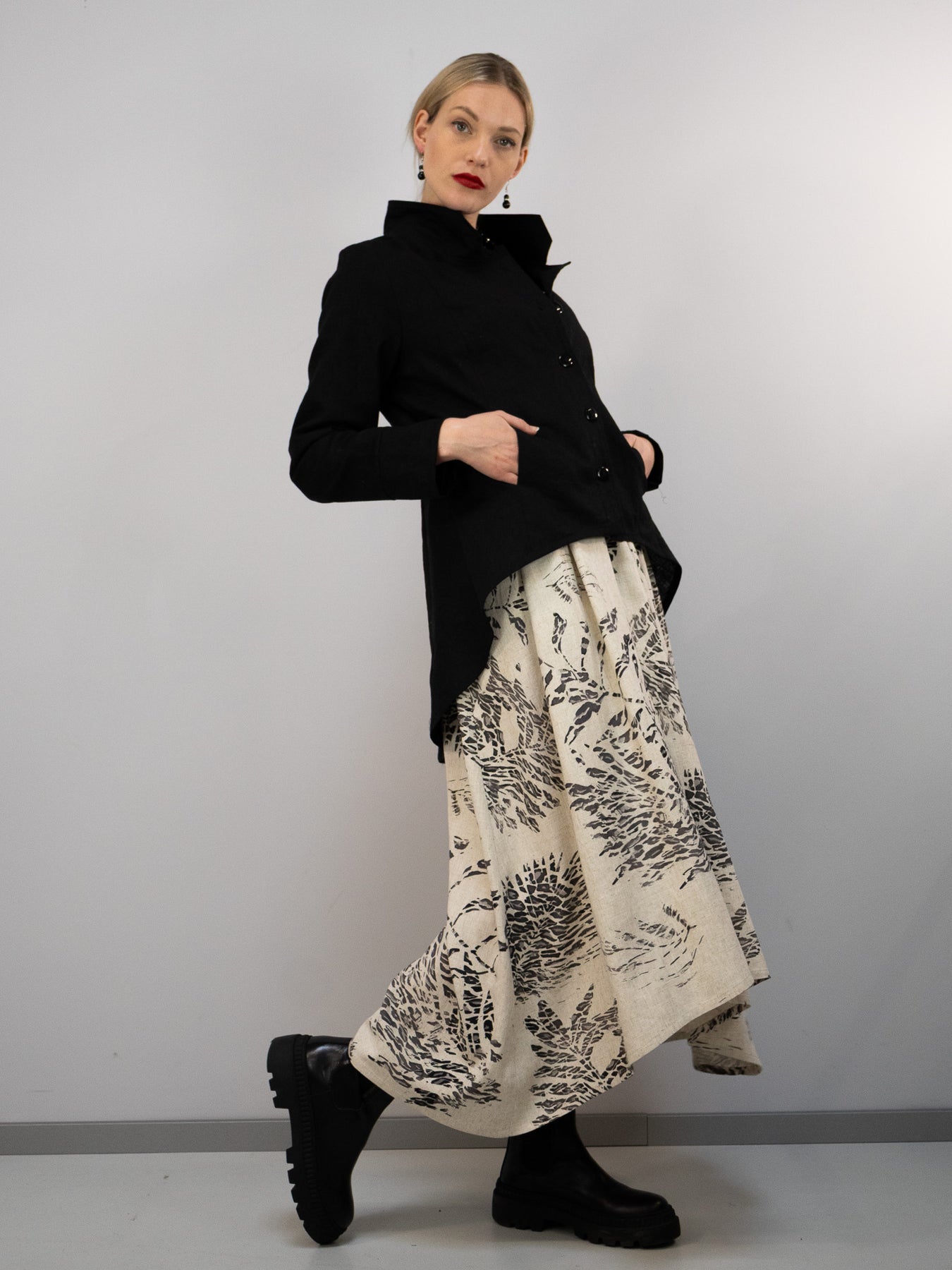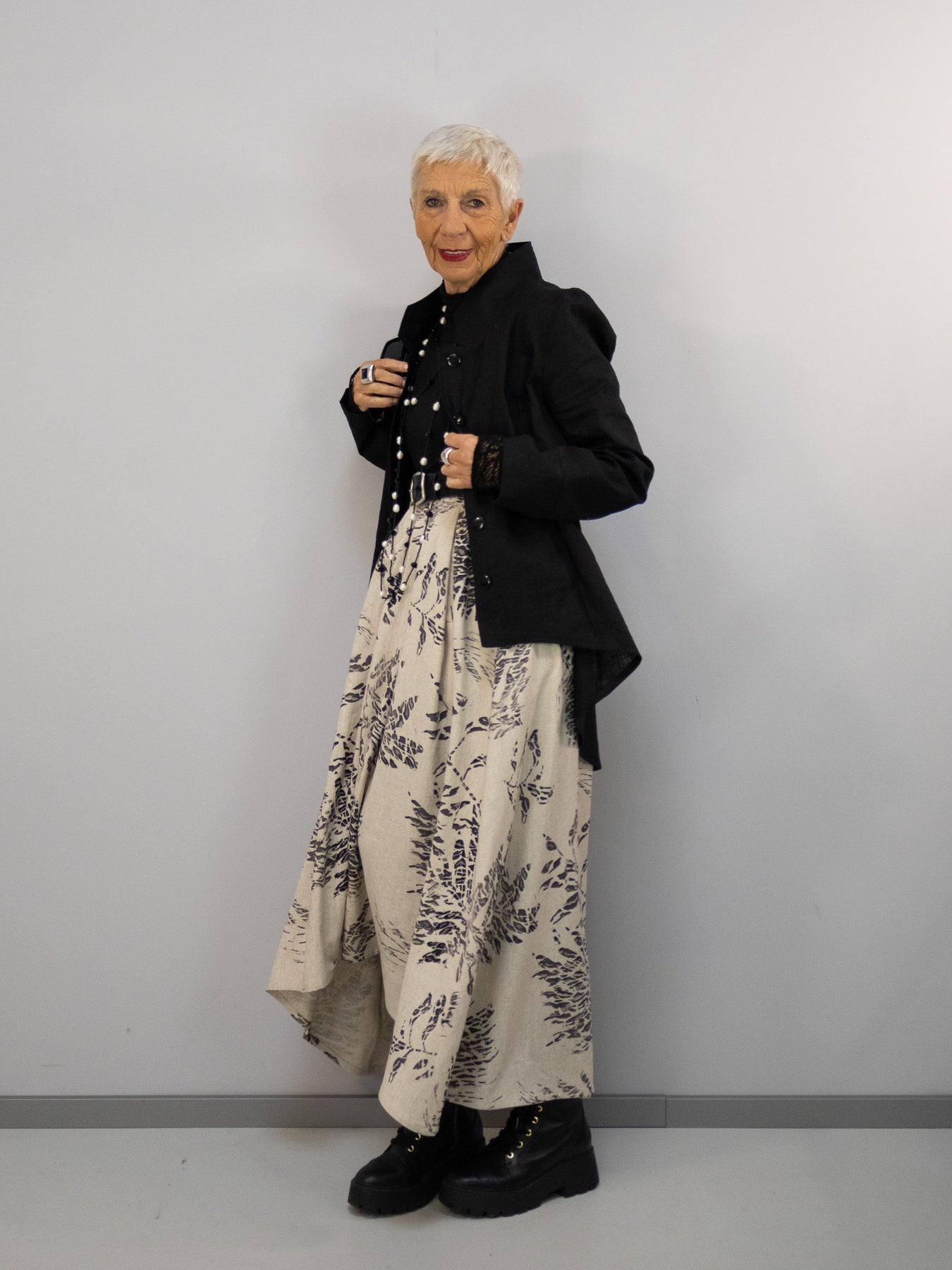 Durch die Kombination aus ruhiger Grundfarbe und kunstvollem Print entsteht ein Rock, der sowohl modern als auch zeitlos wirkt. Die weich fließende Form unterstreicht die feminine Linie, ohne einzuengen – komfortabel, großzügig und vielseitig kombinierbar.