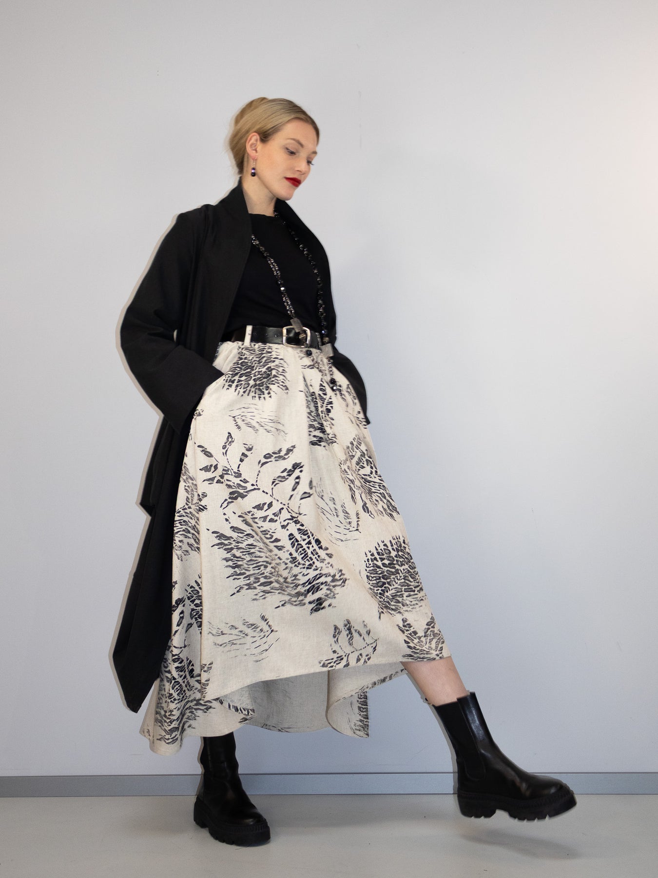 Perfekt kombinierbar mit dem Mantel im gleichen Muster entsteht ein harmonischer Gesamtlook mit besonderer Ausstrahlung. Mit einem schlichten schwarzen Oberteil wirkt der Rock ruhig und elegant – mit Accessoires wird er zum Hingucker.