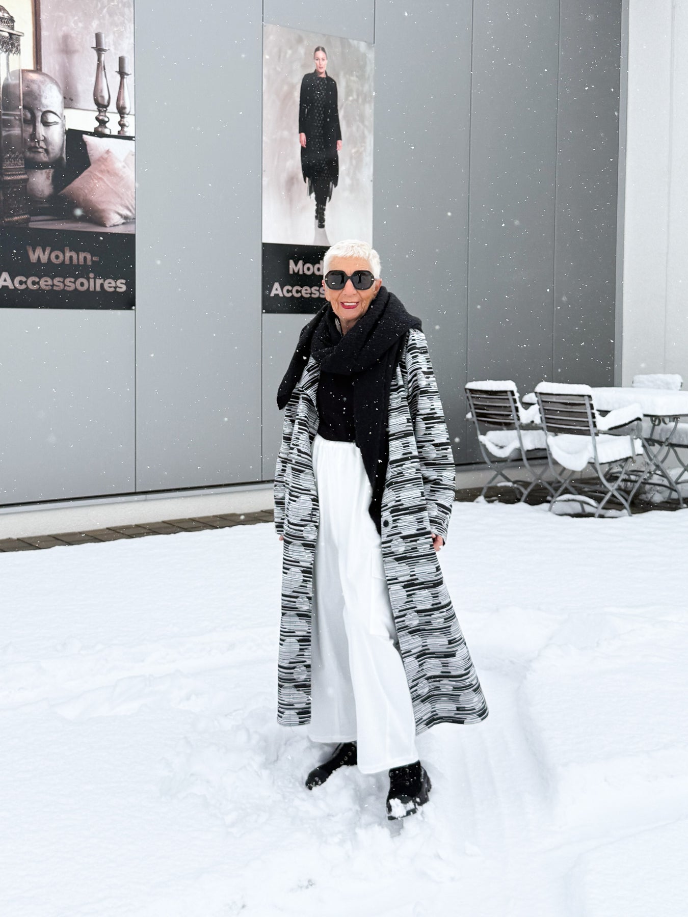 Exklusiver Mantel mit markantem Schwarz-Weiß-Muster, gefertigt in Deutschland aus 95 % Baumwolle und 5 % Elastan. Die Einheitsgröße sorgt für eine bequeme Passform, während seitliche Eingriffstaschen praktischen Komfort bieten. Ein einzigartiges Statement-Piece für stilbewusste Auftritte.