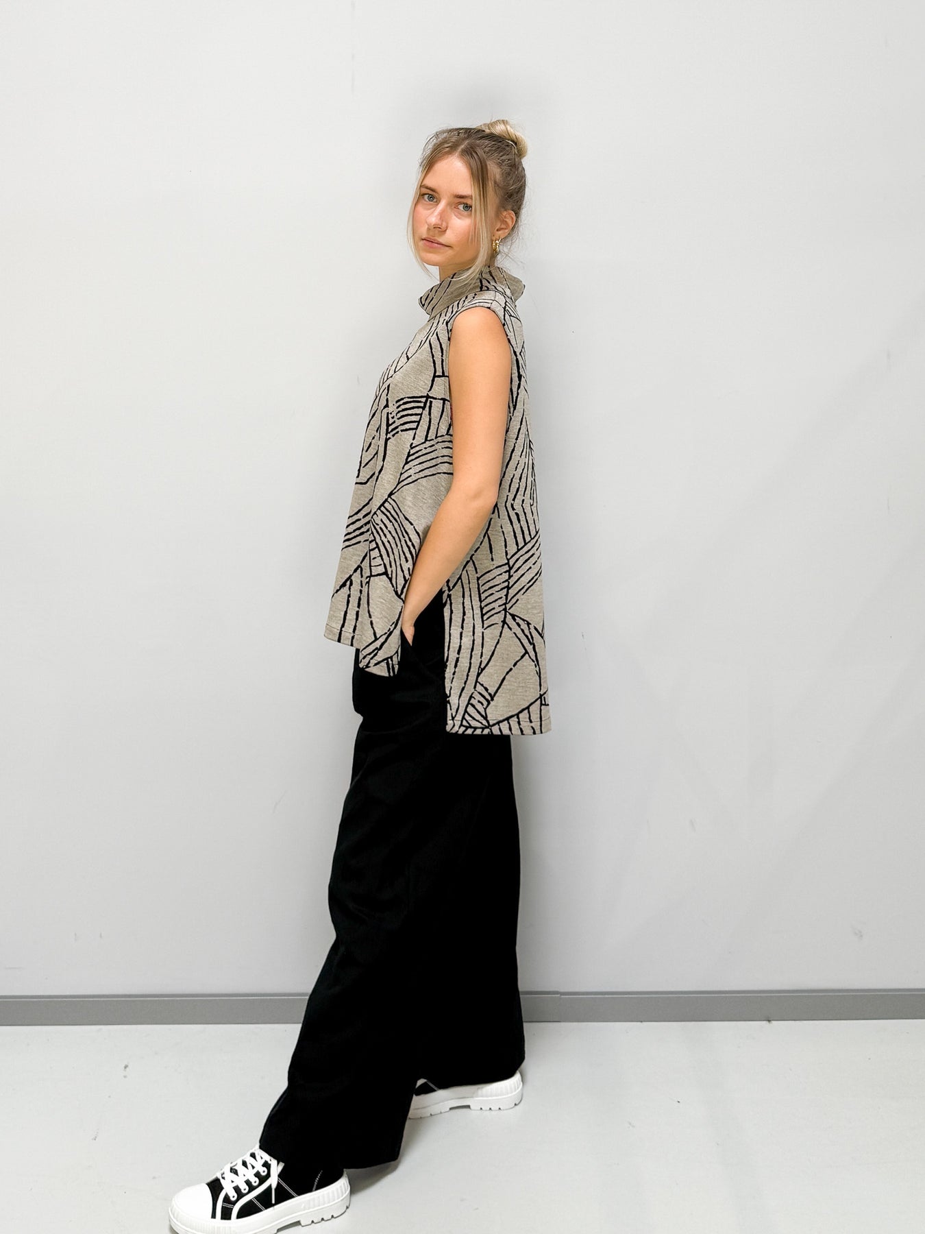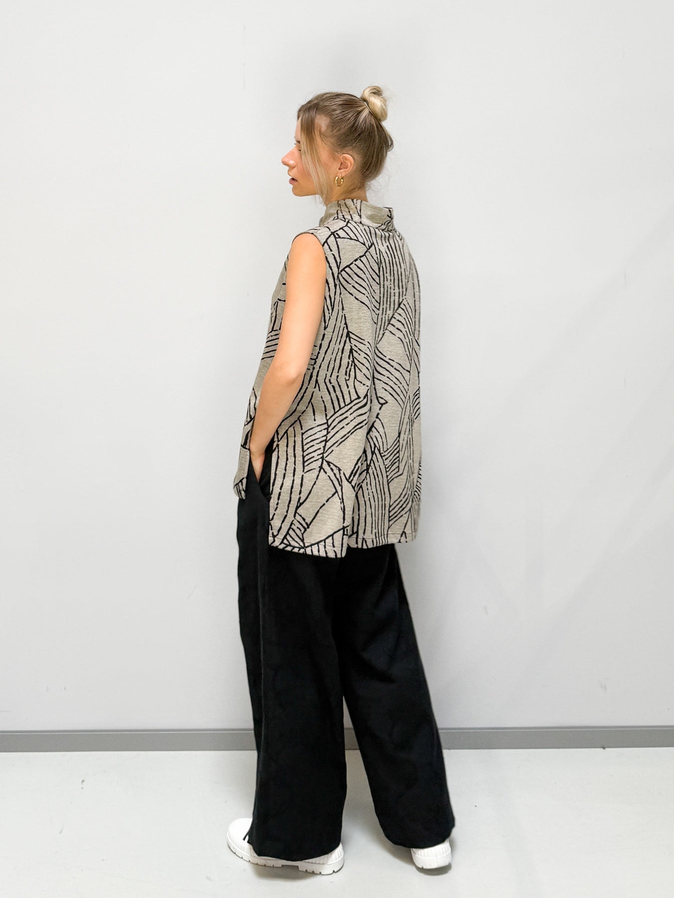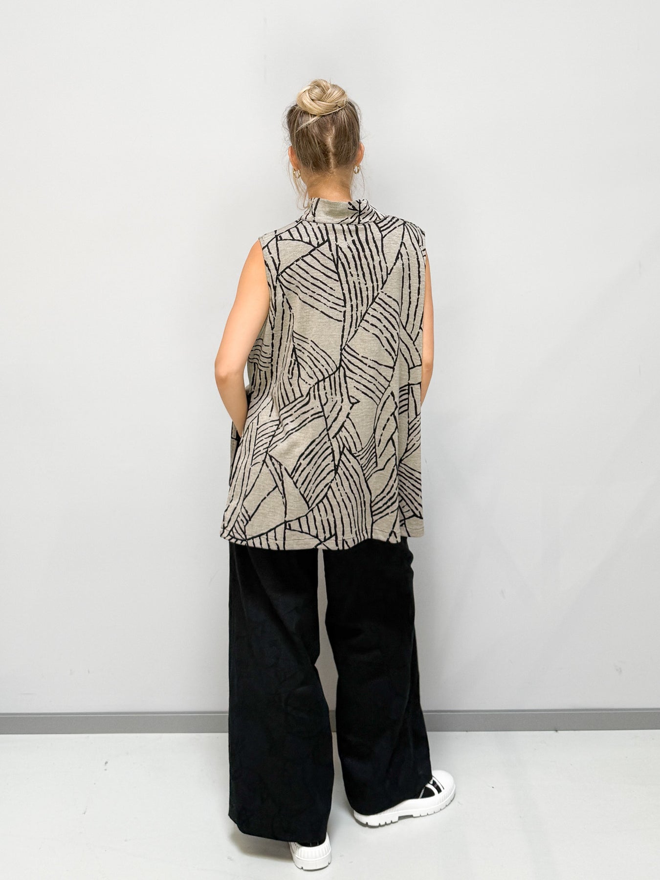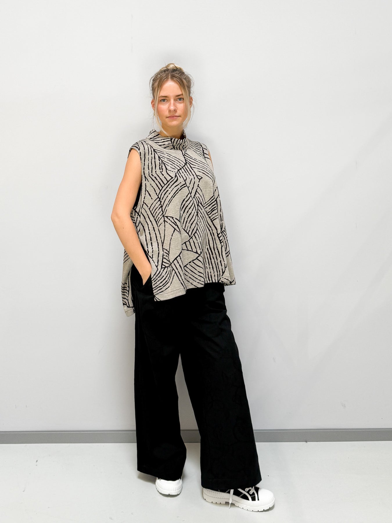 Dieses weit geschnittene Oberteil vereint Leichtigkeit, Komfort und modernes Design. Das grafische Linienmuster verleiht dem Look eine künstlerische Note, während der hochgeschlossene Kragen für eine elegante Silhouette sorgt. Der fließende Schnitt umspielt die Figur und bietet maximale Bewegungsfreiheit – perfekt für einen stilvollen, aber entspannten Auftritt.
