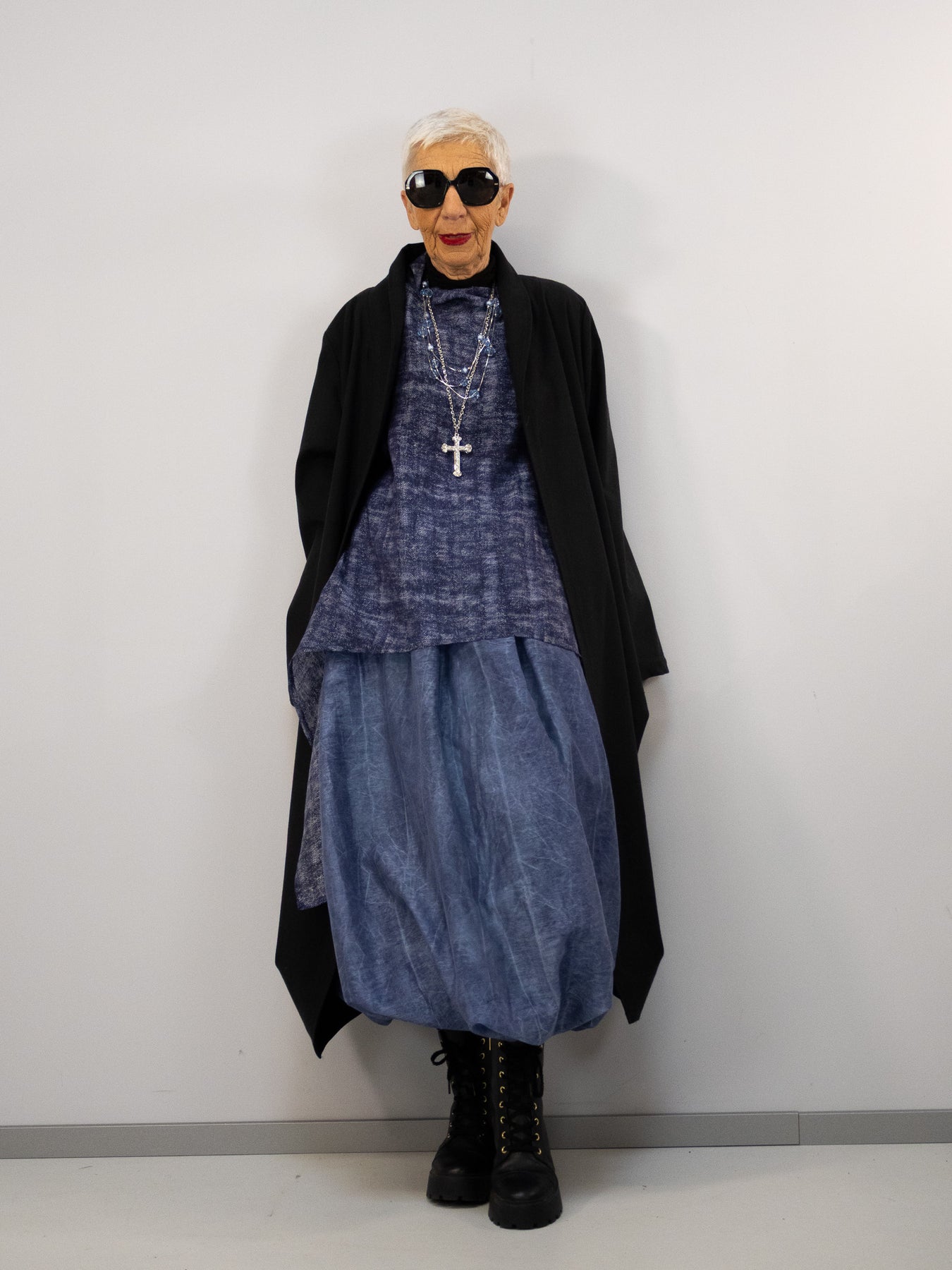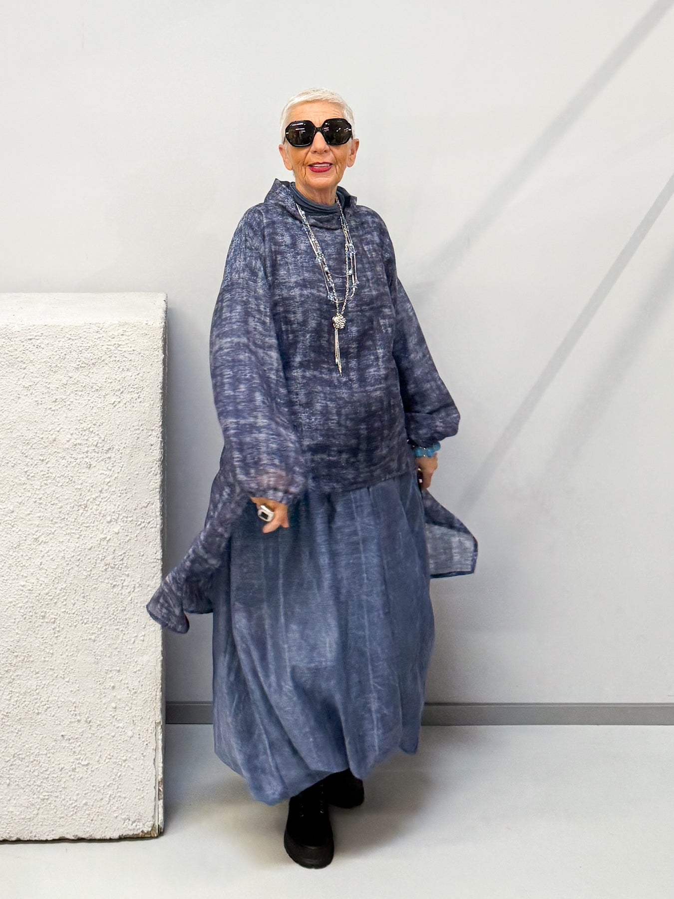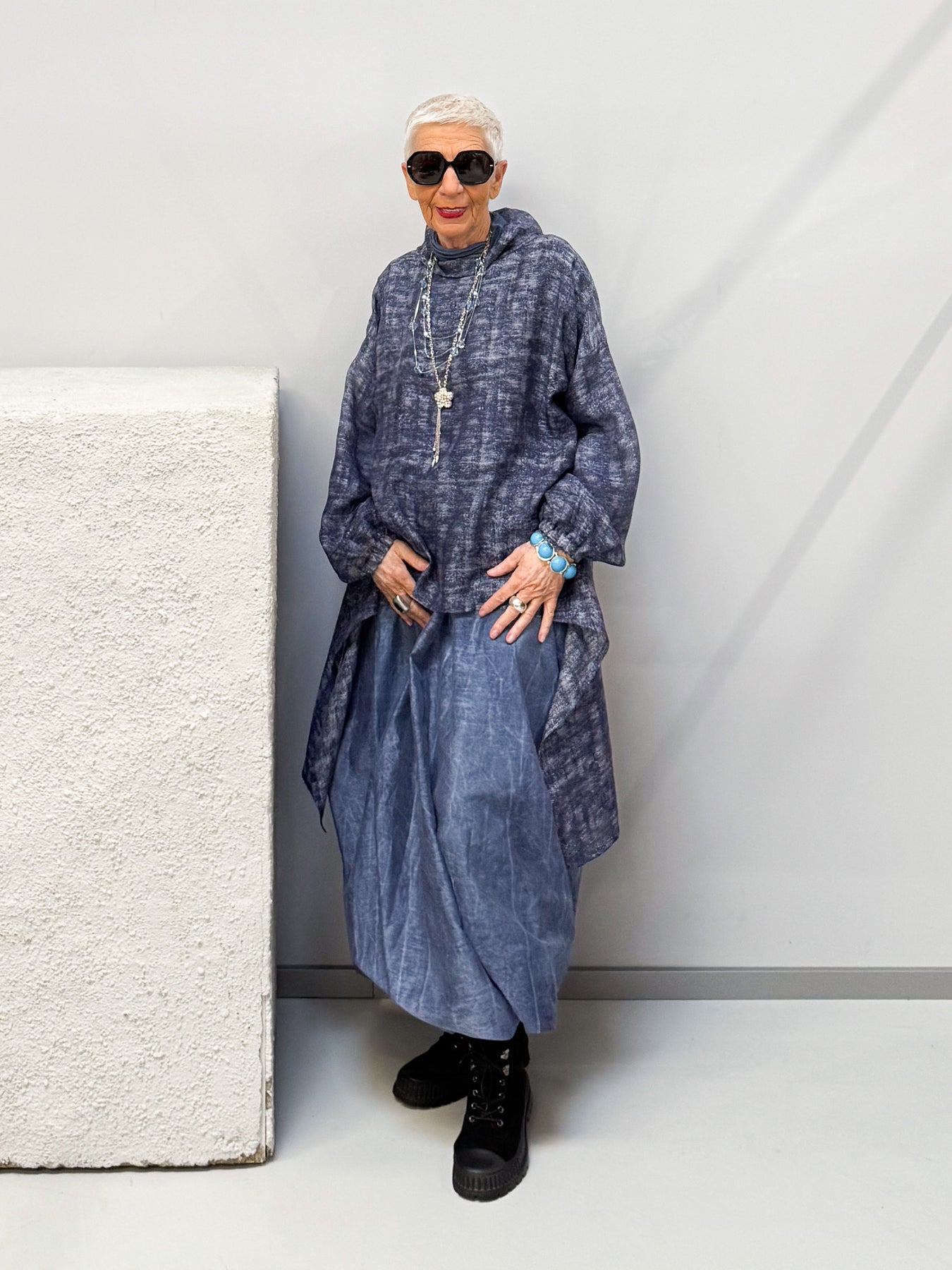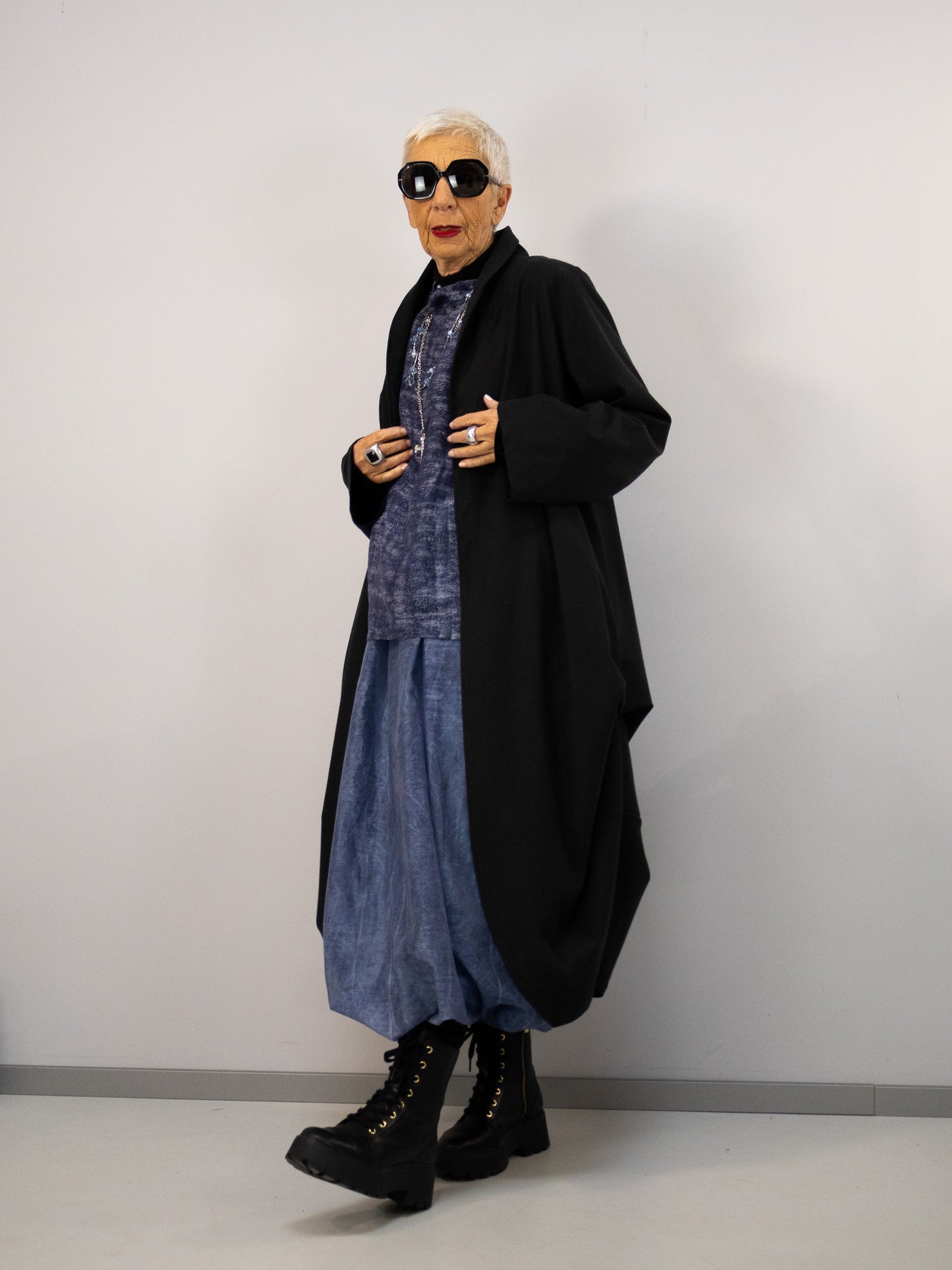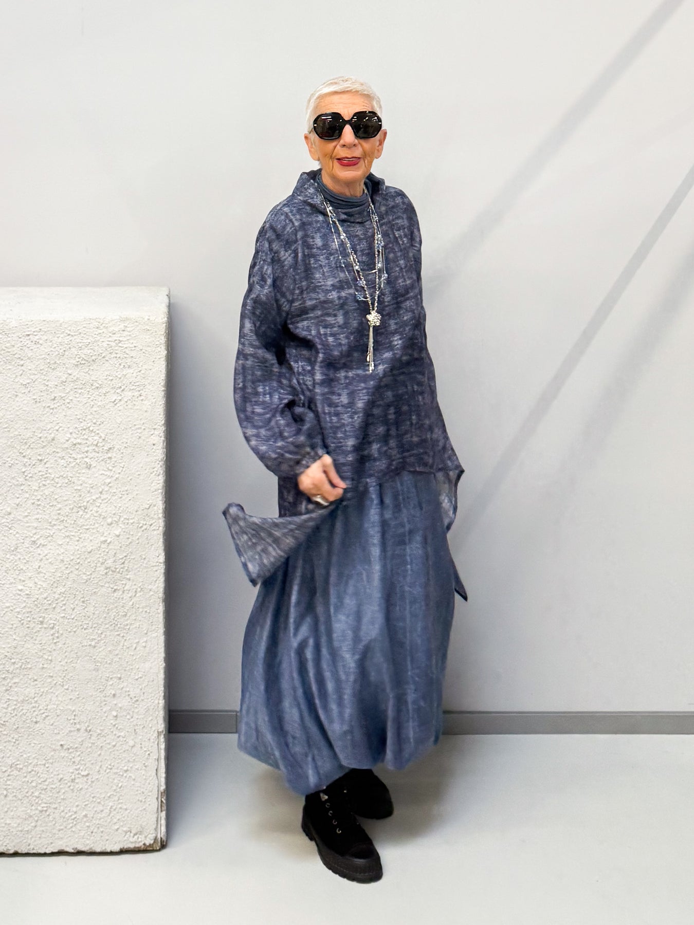 Auf dem Bild kombiniert mit unserem schwarzen Ballonmantel und dem blauen Rock entsteht ein moderner, ausdrucksstarker Look. Die Tunika lässt sich ebenso wunderbar zu schlichten Hosen oder Röcken stylen – für Alltag und besondere Anlässe.