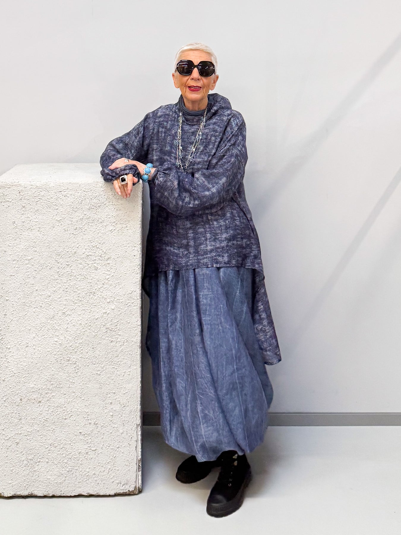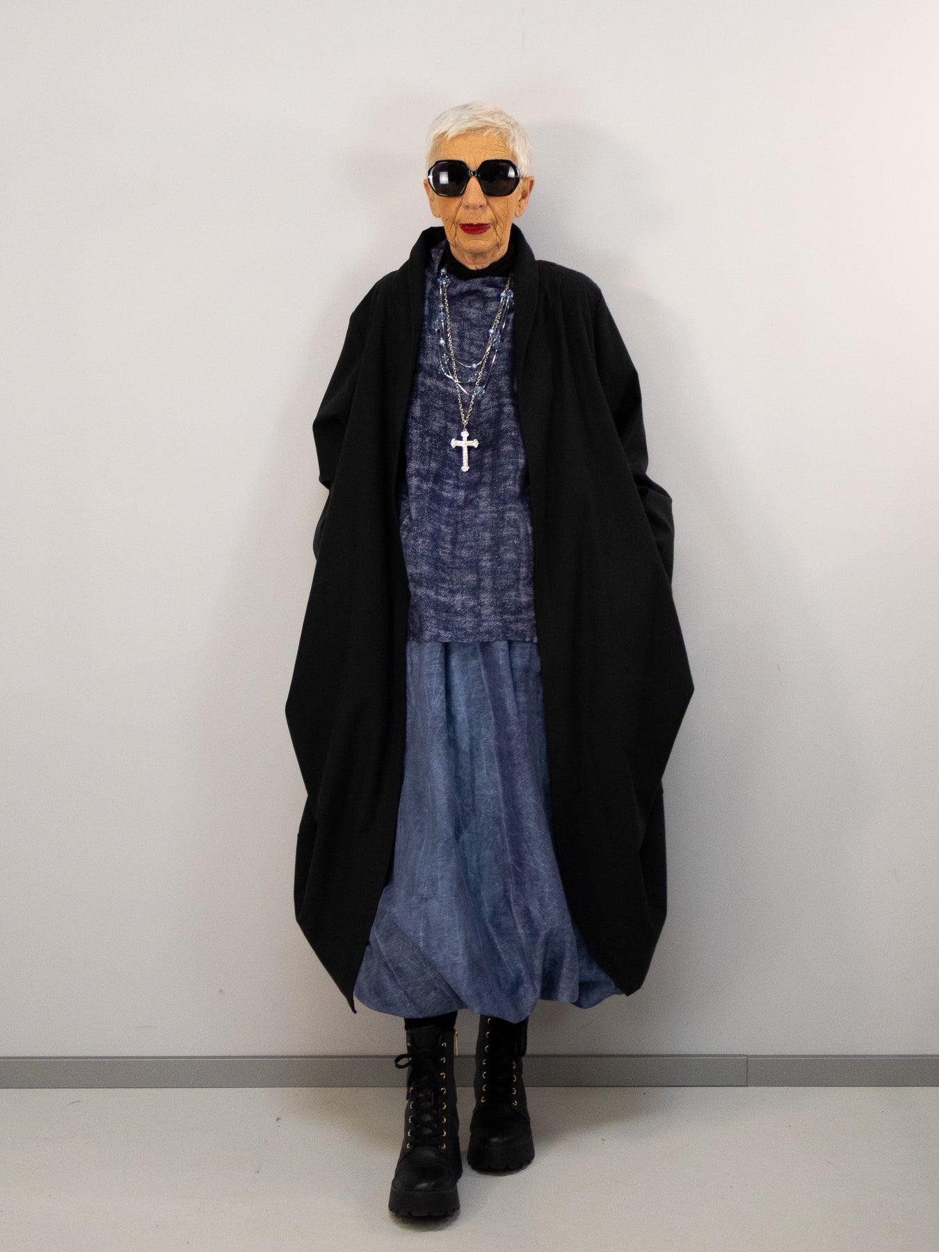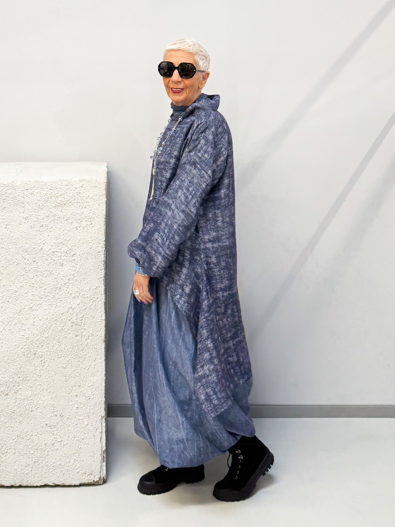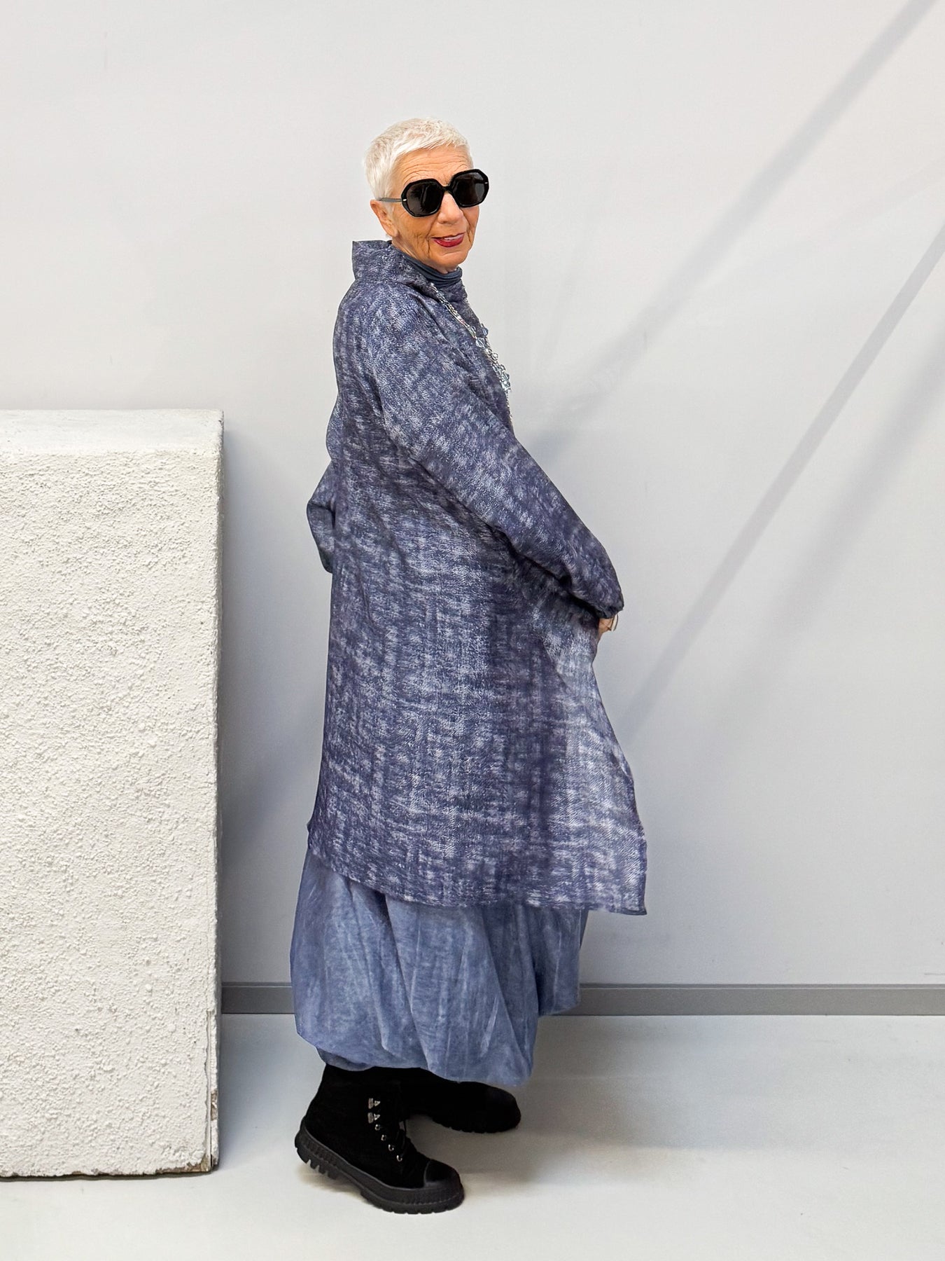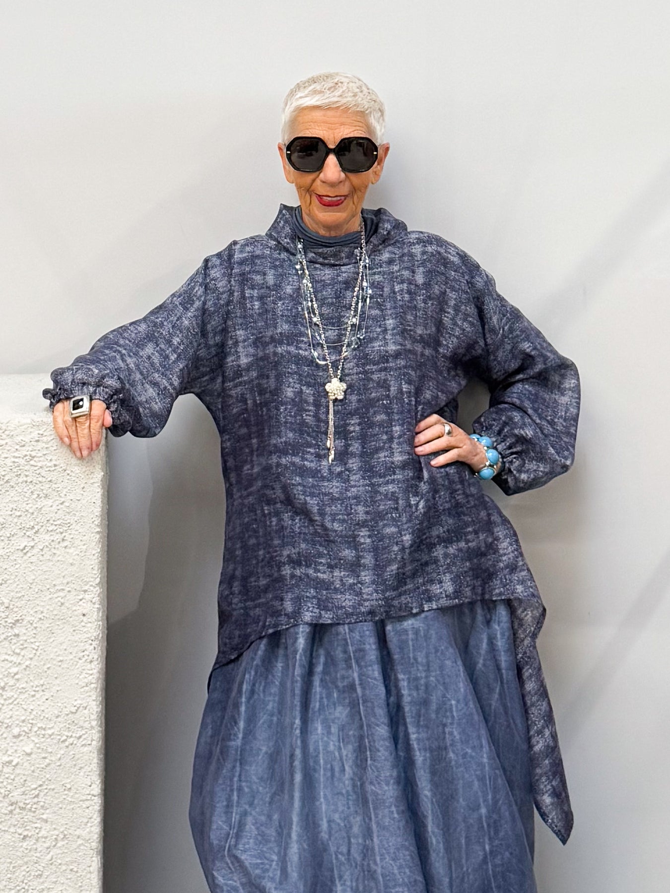 Auf dem Bild kombiniert mit unserem schwarzen Ballonmantel und dem blauen Rock entsteht ein moderner, ausdrucksstarker Look. Die Tunika lässt sich ebenso wunderbar zu schlichten Hosen oder Röcken stylen – für Alltag und besondere Anlässe.