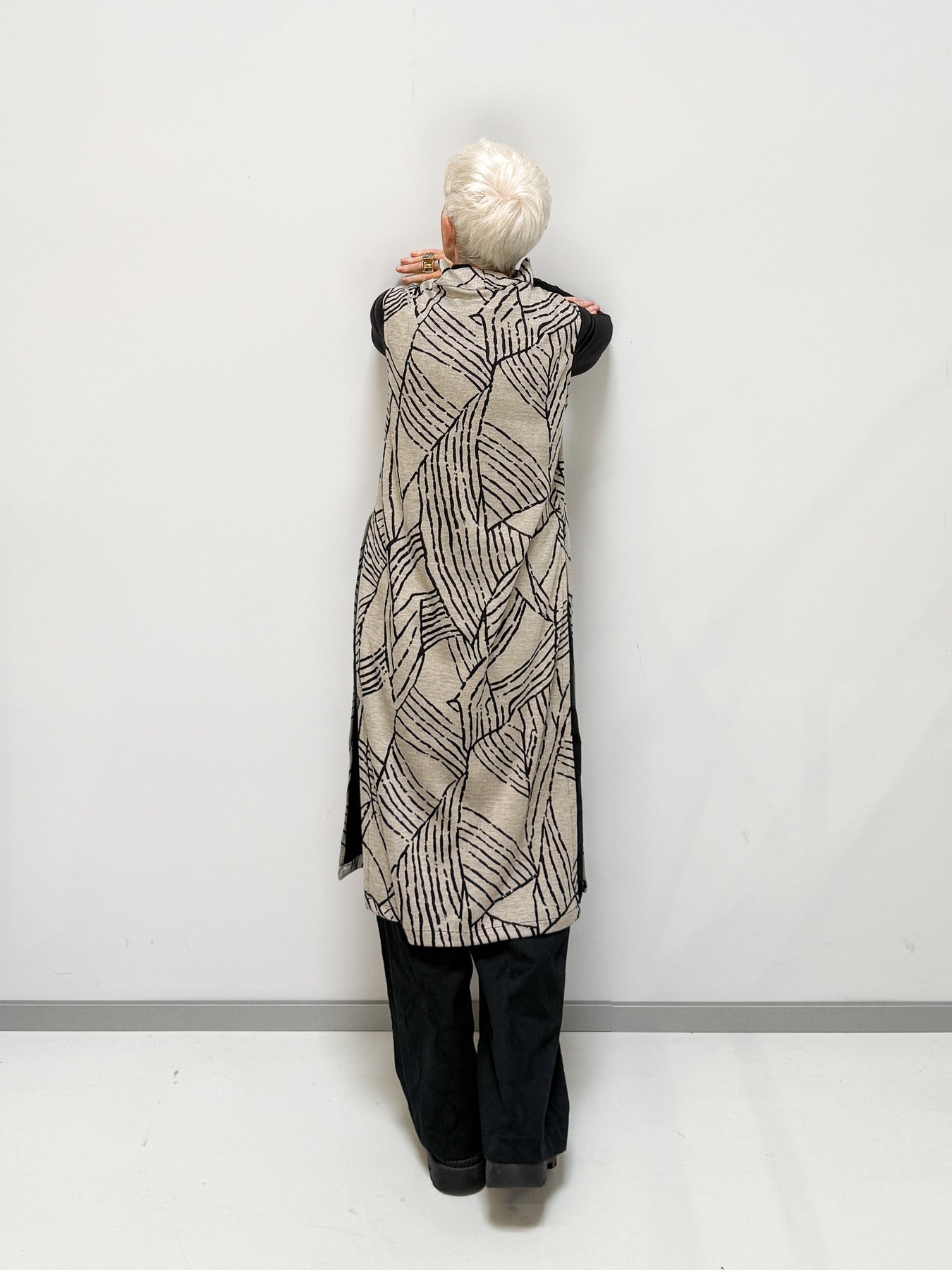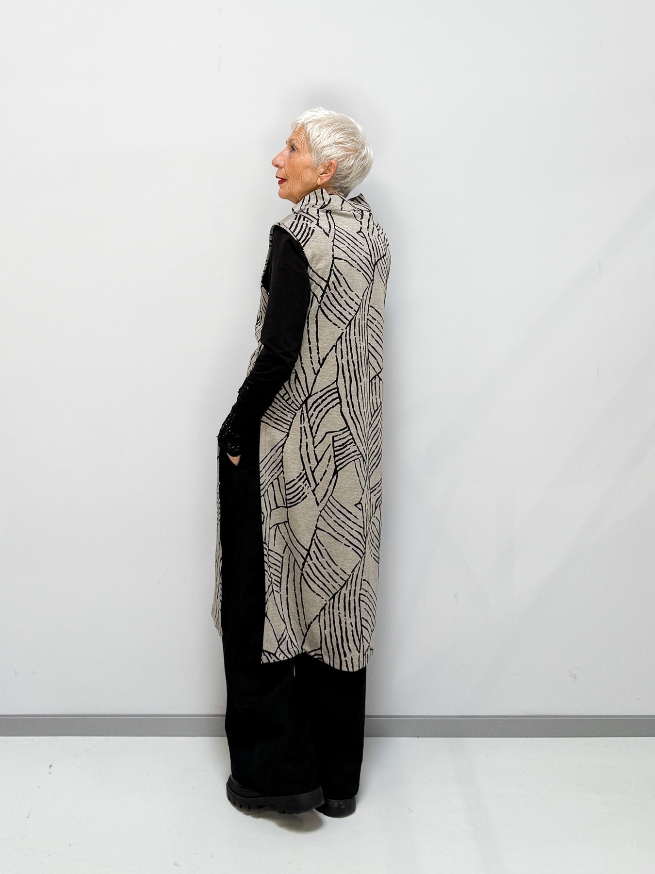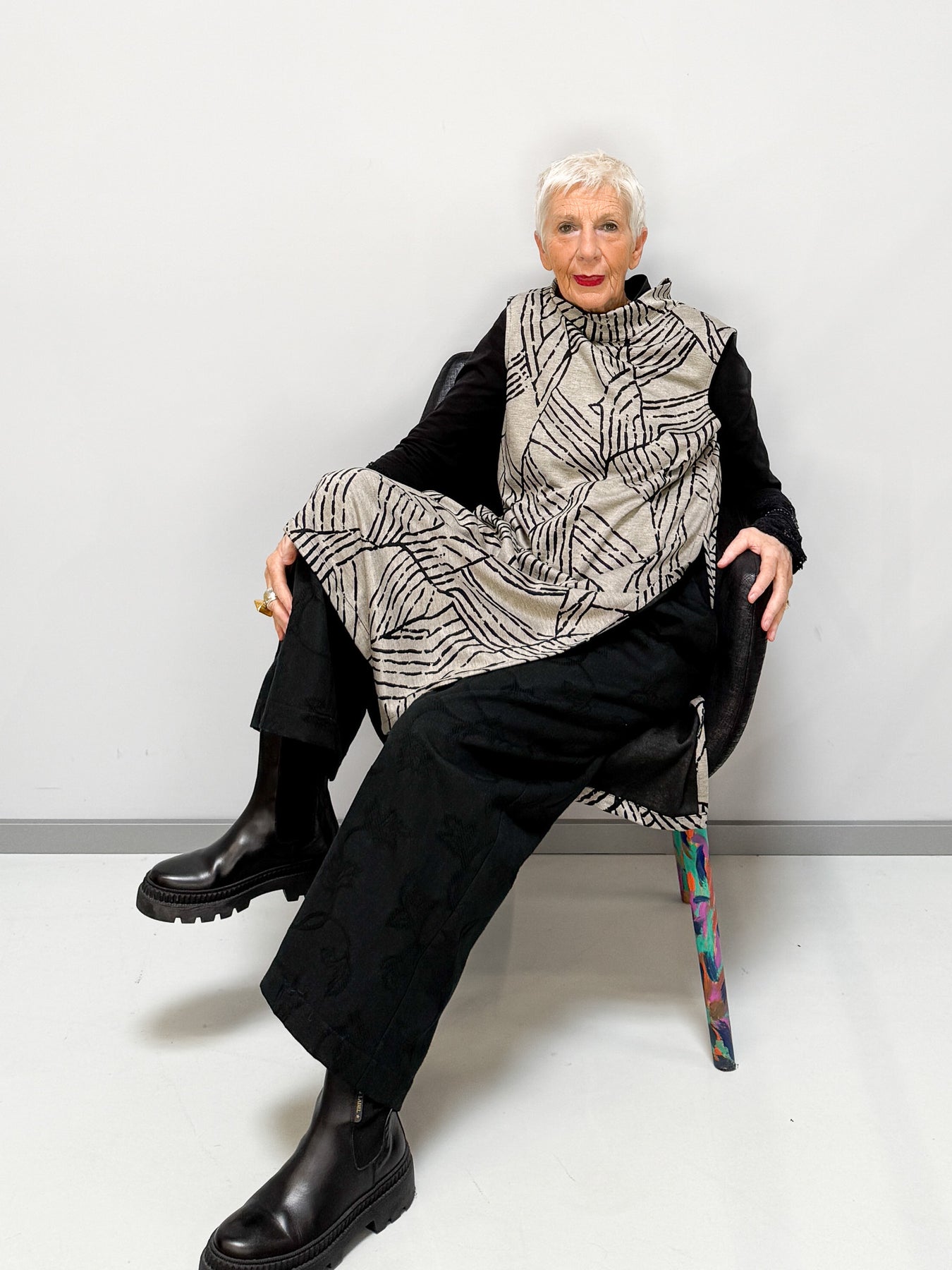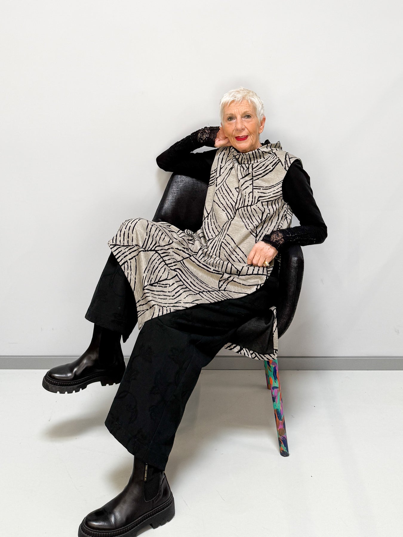 Diese elegante Tunika überzeugt durch ihre fließende Silhouette und das markante grafische Muster, das ihr einen modernen, künstlerischen Charakter verleiht. Der lockere, leicht ausgestellte Schnitt sorgt für eine schmeichelnde Passform und macht sie zum idealen Begleiter für stilvolle Alltags- und Freizeitlooks.