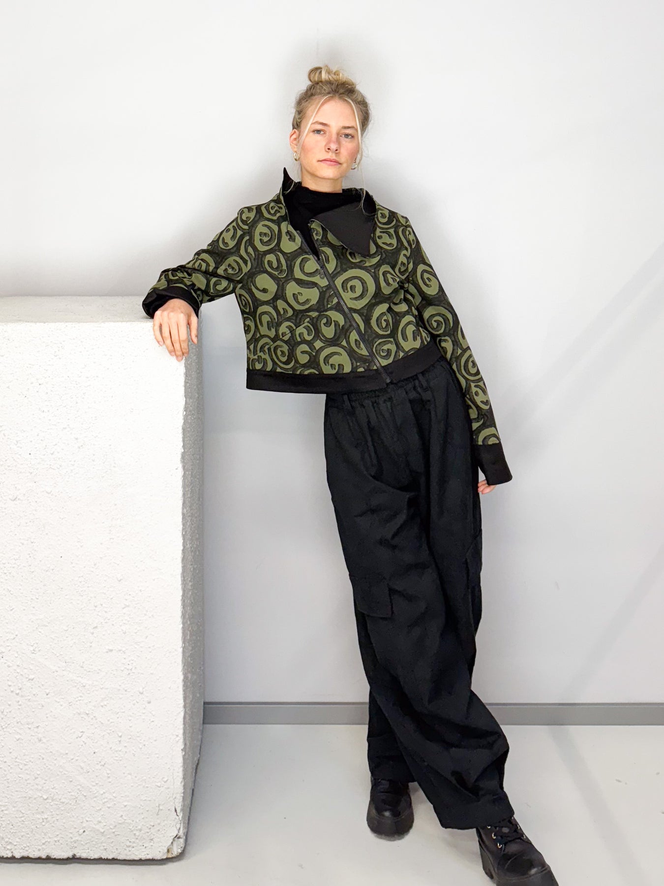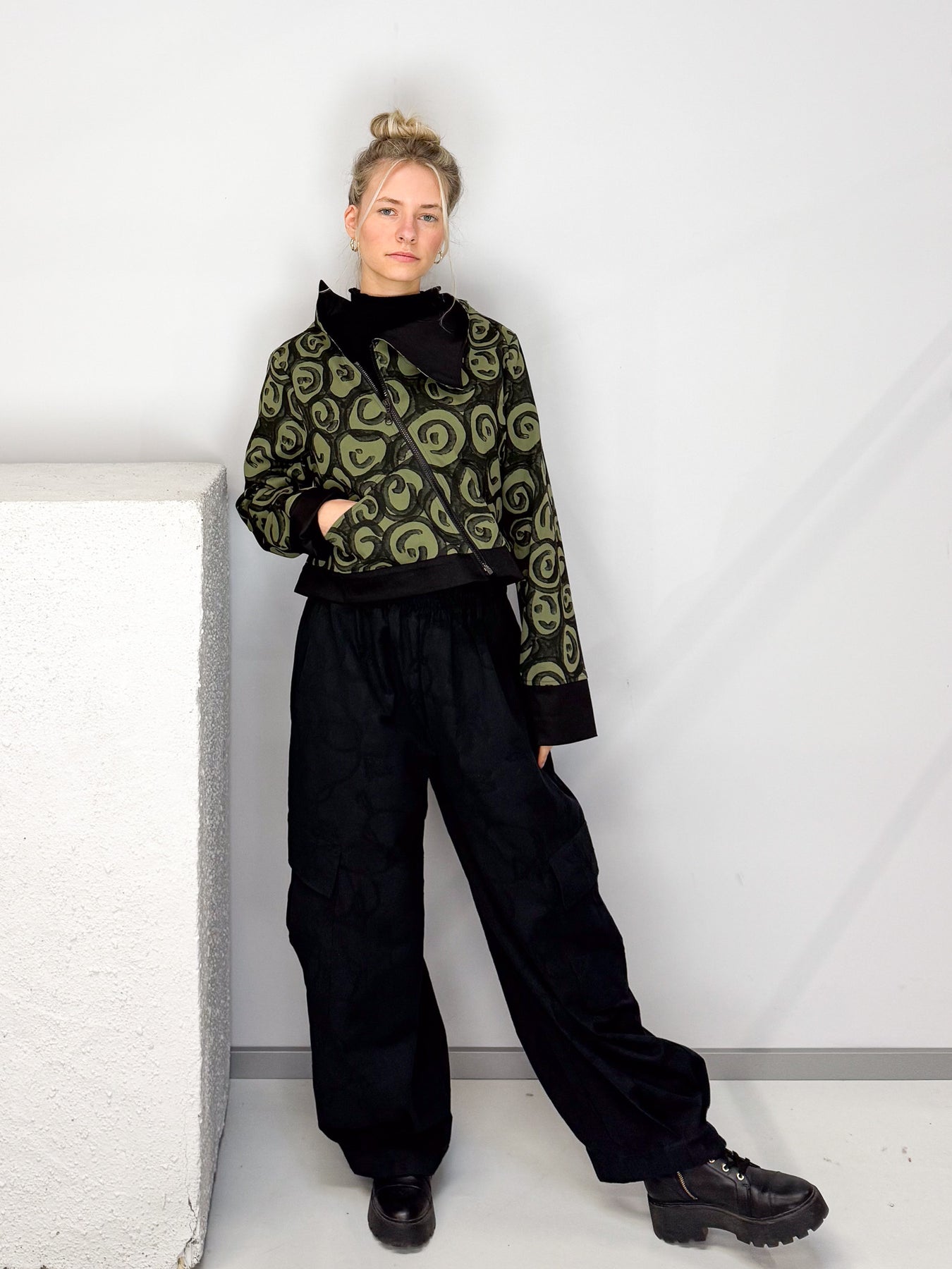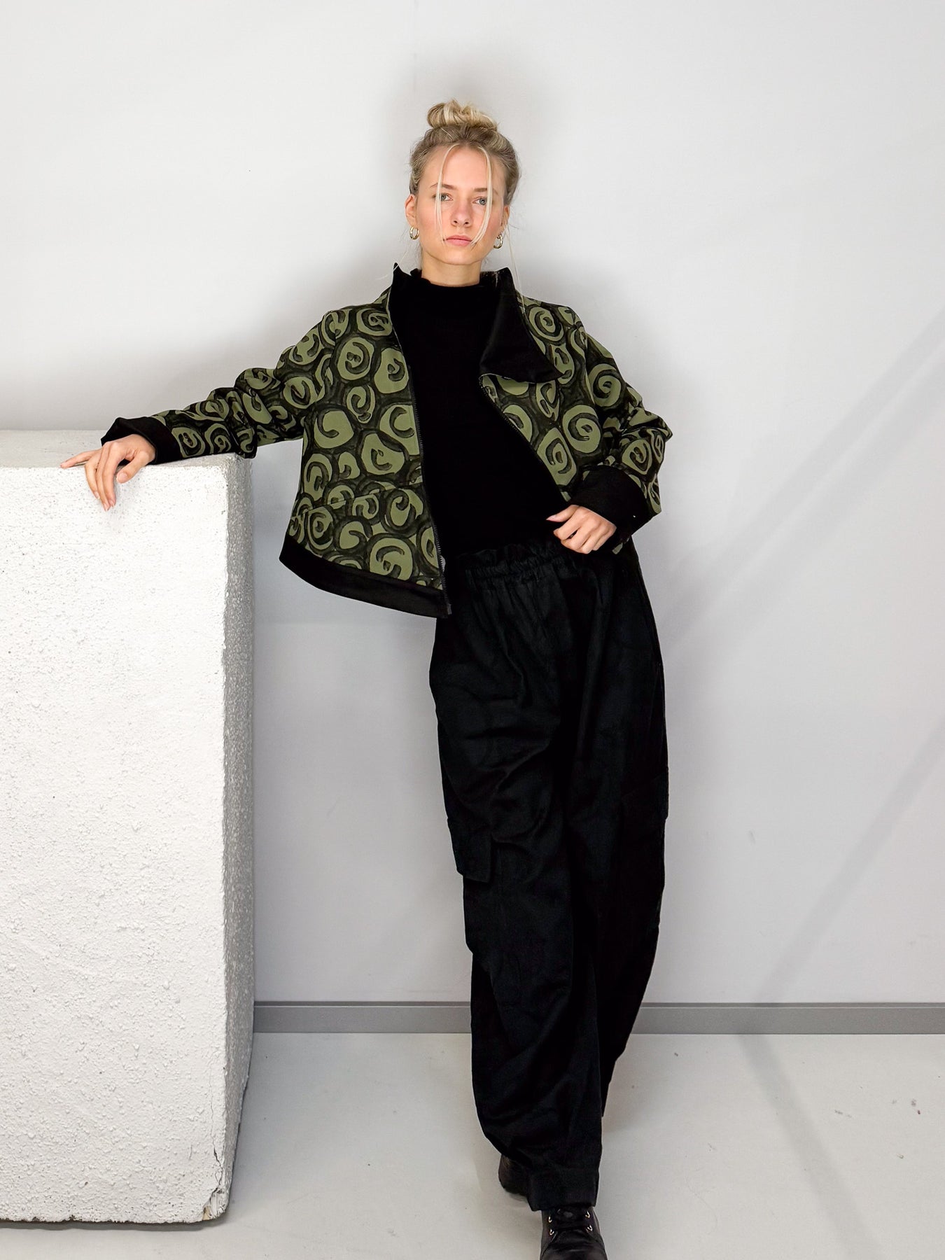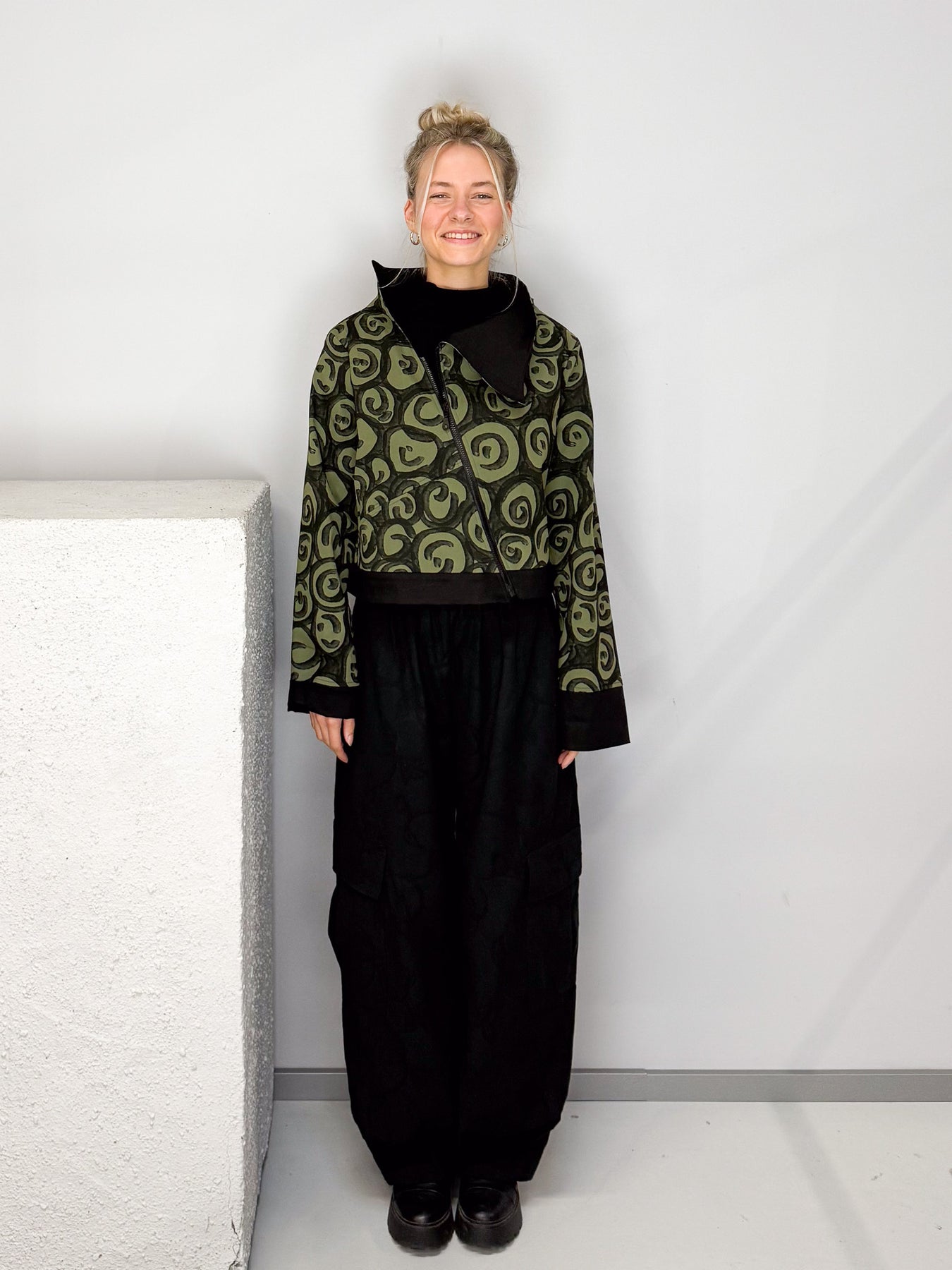 Das markante Spiral-Muster in Schwarz auf Olivgrün macht die Jacke zu einem echten Hingucker. Schwarze Akzente an Kragen und Ärmelabschlüssen unterstreichen den modernen, eleganten Look. Seitliche Eingriffstaschen bieten praktische Funktionalität.