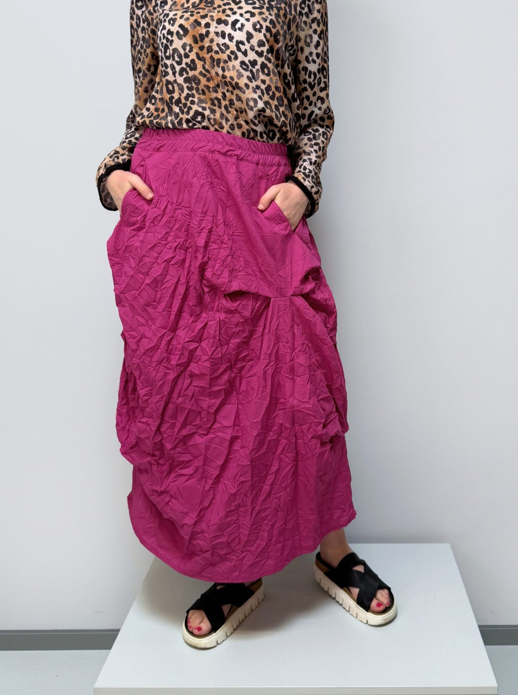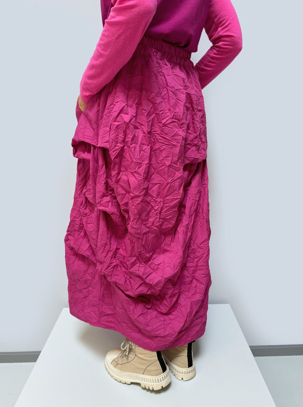 Unser langer Rock aus gecrashtem Material vereint Komfort und Stil auf elegante Weise. Hergestellt aus hochwertigem, leichtem Stoff bietet er eine angenehme Passform und eine einzigartige Textur, die das Auge anspricht. Der elastische Gummibund sorgt für eine bequeme Passform und ermöglicht eine einfache Anpassung an deine Taille, während die praktischen Taschen auf beiden Seiten genügend Platz für deine Essentials bieten.